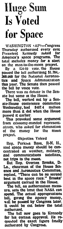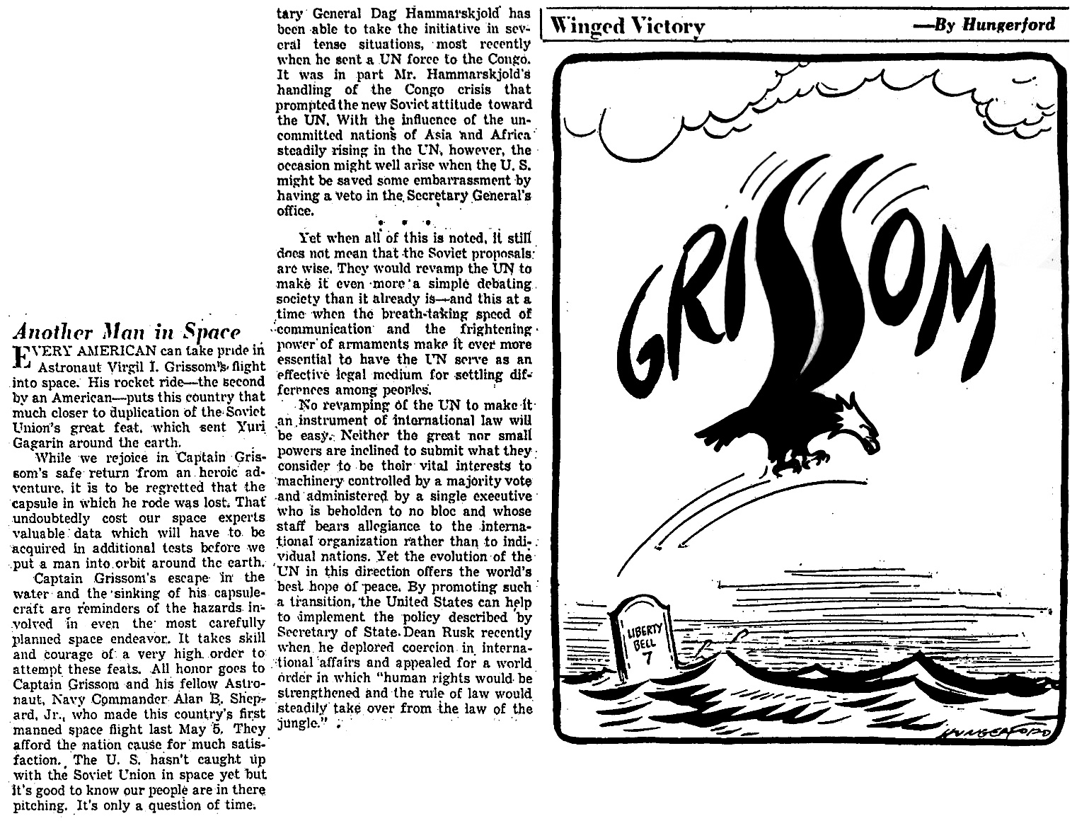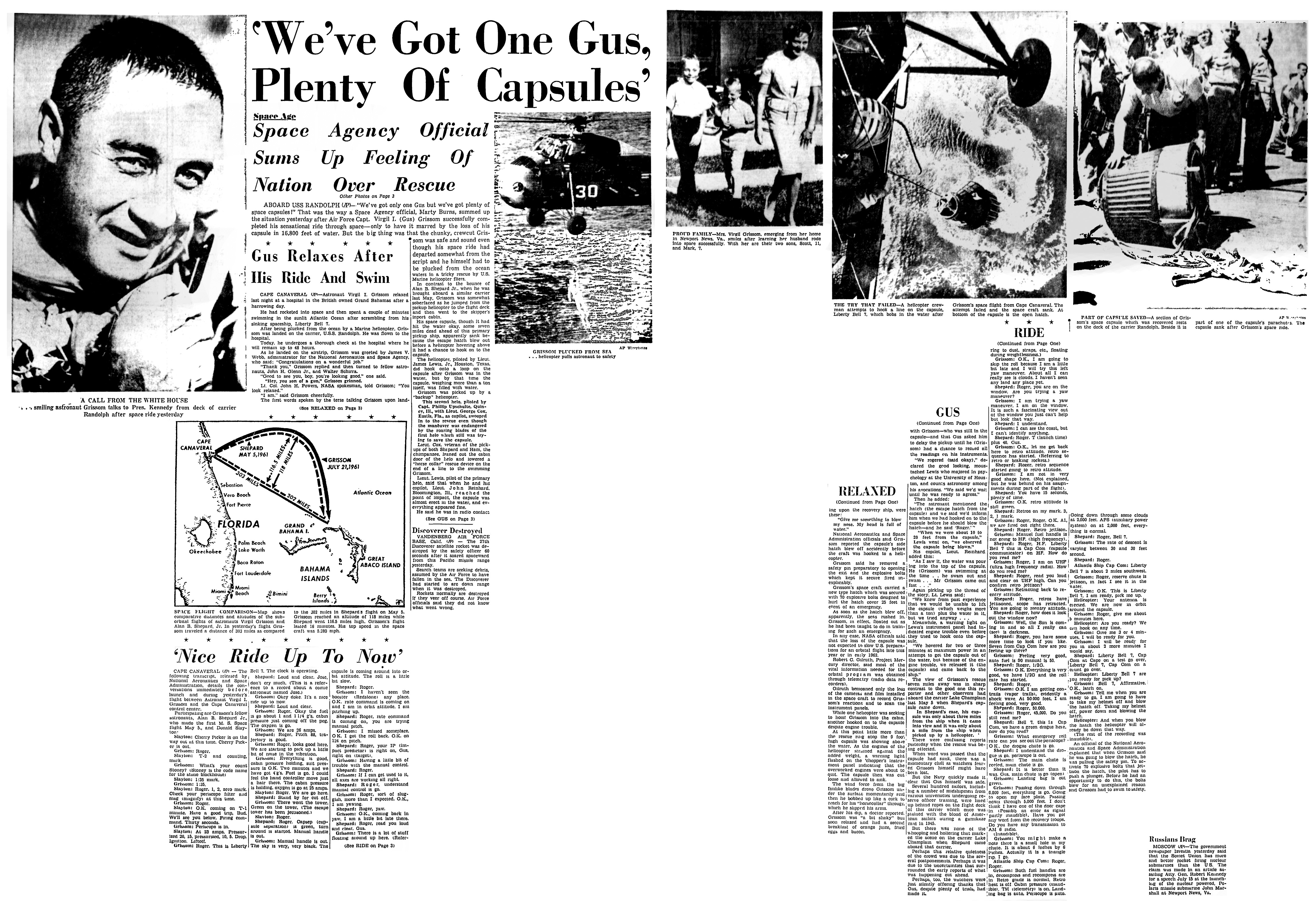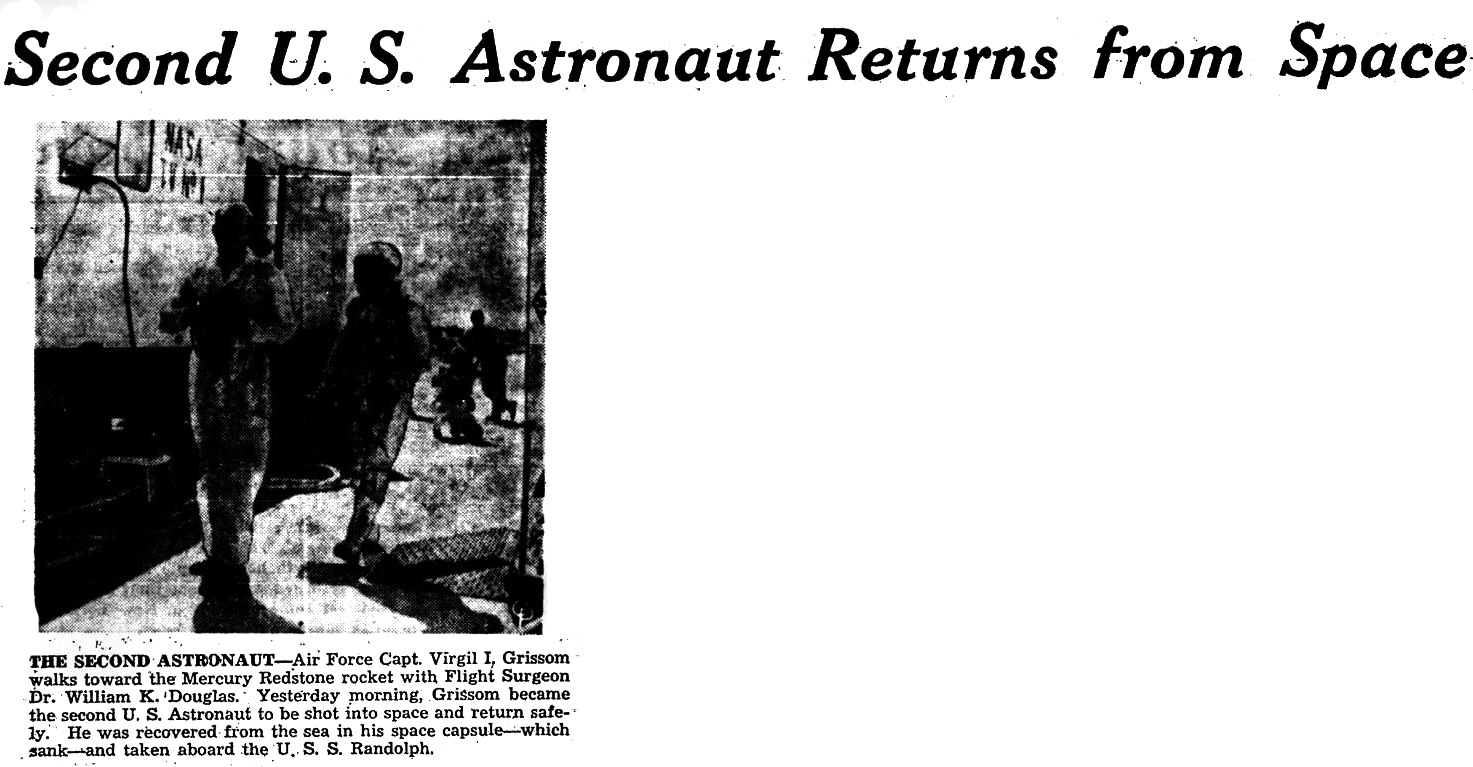 «Сегодня Соединенные Штаты запустили на мысе Канаверал ракету "Редстоун" с Вирджилом Гриссомом на борту. Ракета доставила астронавта на высоту 118 миль (188,8 километров). Согласно сообщениям новостных агентств, астронавт благополучно приземлился в Атлантике на расстоянии порядка 305 миль (488) километров от места запуска».