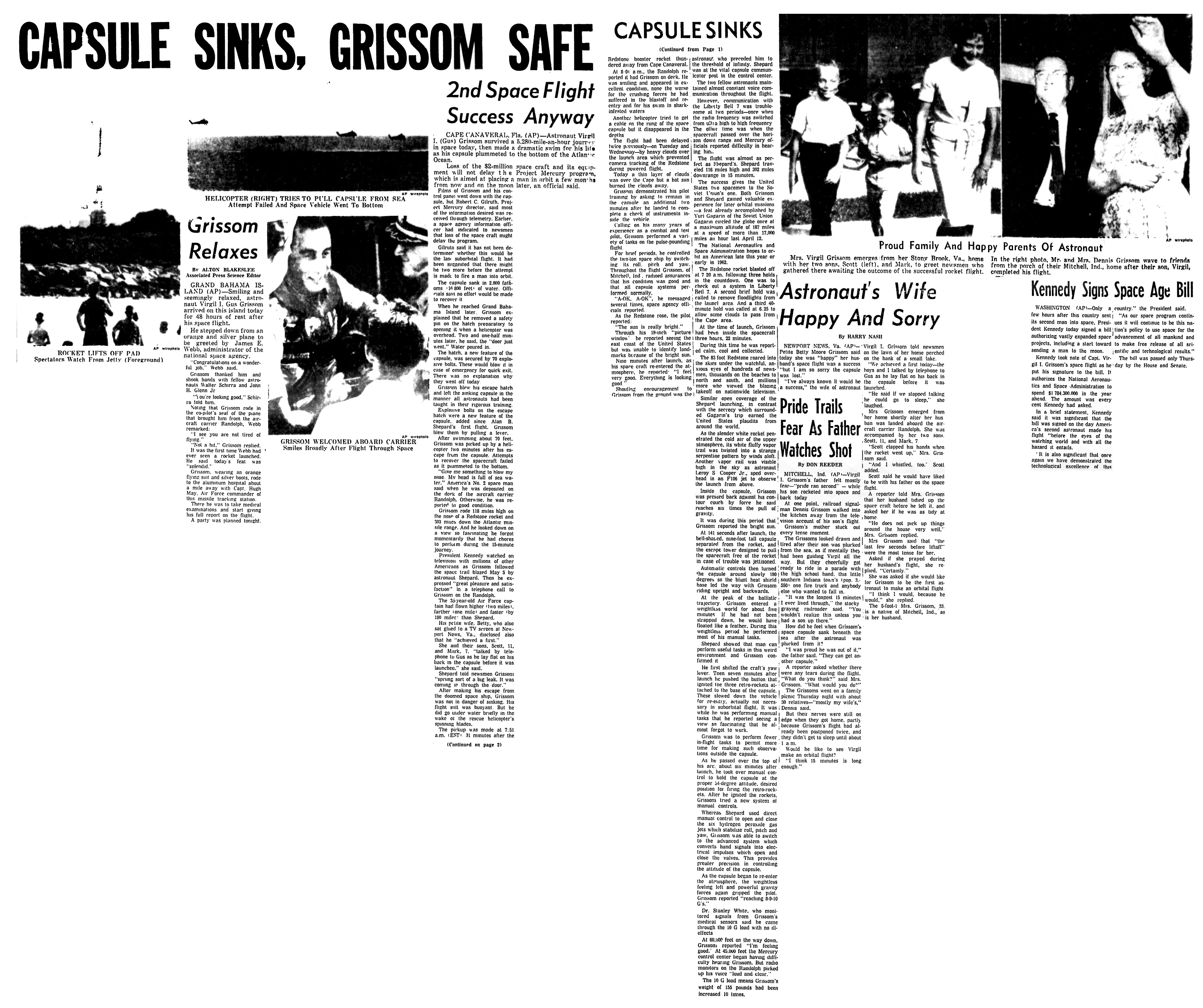 Лондон. Космическое свершение капитана Вирджила А. Гриссома сегодня вечером попало в заголовки газет Лондона, как почти катастрофа, которая могла стоить жизни астронавту США.