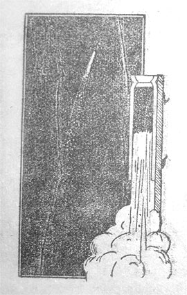 Один ученый специалист по воздухоплаванию, Циолковский, задумал преодолеть трудности под'ема в небо не на аэроплане, а на ракете. Ракета — это открытая с одной стороны трубка, наполненная взрывчатым веществом. Если вещество это зажечь, установив ракету открытым концом вниз, то ракета полетит вверх (рис. 1) и будет прибавлять скорость до тех пор, пока не сгорит весь запас взрывчатого вещества. После этого ракета еще немного поднимется, но, израсходовав всю свою под'емную силу, остановится и упадет на землю. Однако, по расчетам Циолковского, можно выстроить такую ракету, которая залетит вверх далеко за пределы воздуха, утеряет связь с землей и на землю не вернется. Она может либо остаться в небесном просторе и начать летать вокруг земли, как луна, или перелетит грань притяжения земли и упадет на какую-нибудь другую планету, например на луну, или, наконец, навсегда удалится в межзвездное пространство. Циолковский точно рассчитал, как нужно построить такую ракету, сколько нужно взять в нее взрывчатого вещества, сколько может в ней разместится людей (рис. 2).