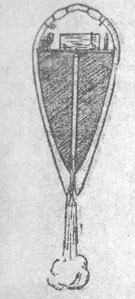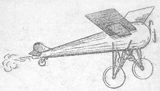 Ему приходит в голову счастливая мысль соединить ракету с аэропланом (рис. 3). Ракета эта будет иметь 2 пары крыльев, малую и большую, будет снабжена мощным мотором, работающим взрывчатой газовой смесью (смесь кислорода и водорода), и ракетным прибором, в котором будет взрываться та же смесь из газов. Отлет с земли на таком междупланетном корабле ничем не будет отличаться от обыкновенного отлета на аэроплане. Прибор будет постепенно развивать скорость и никакого вреда путешественникам при этом случиться не может. Первые 25 верст — под'ема прибор сделает, с помощью мотора, дальше мотор будет выключен; на такой высоте толку от мотора все равно не будет, воздух там слишком редок. Дальше будет пущен ракетный прибор, а на высоте больше 100 верст и он прекратит свою работу и корабль понесется в пространстве уже с разгона (по инерции).