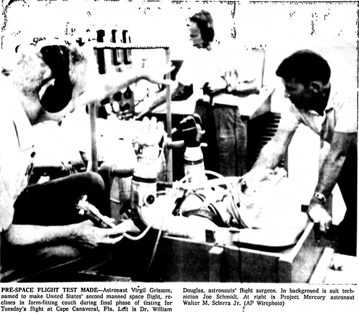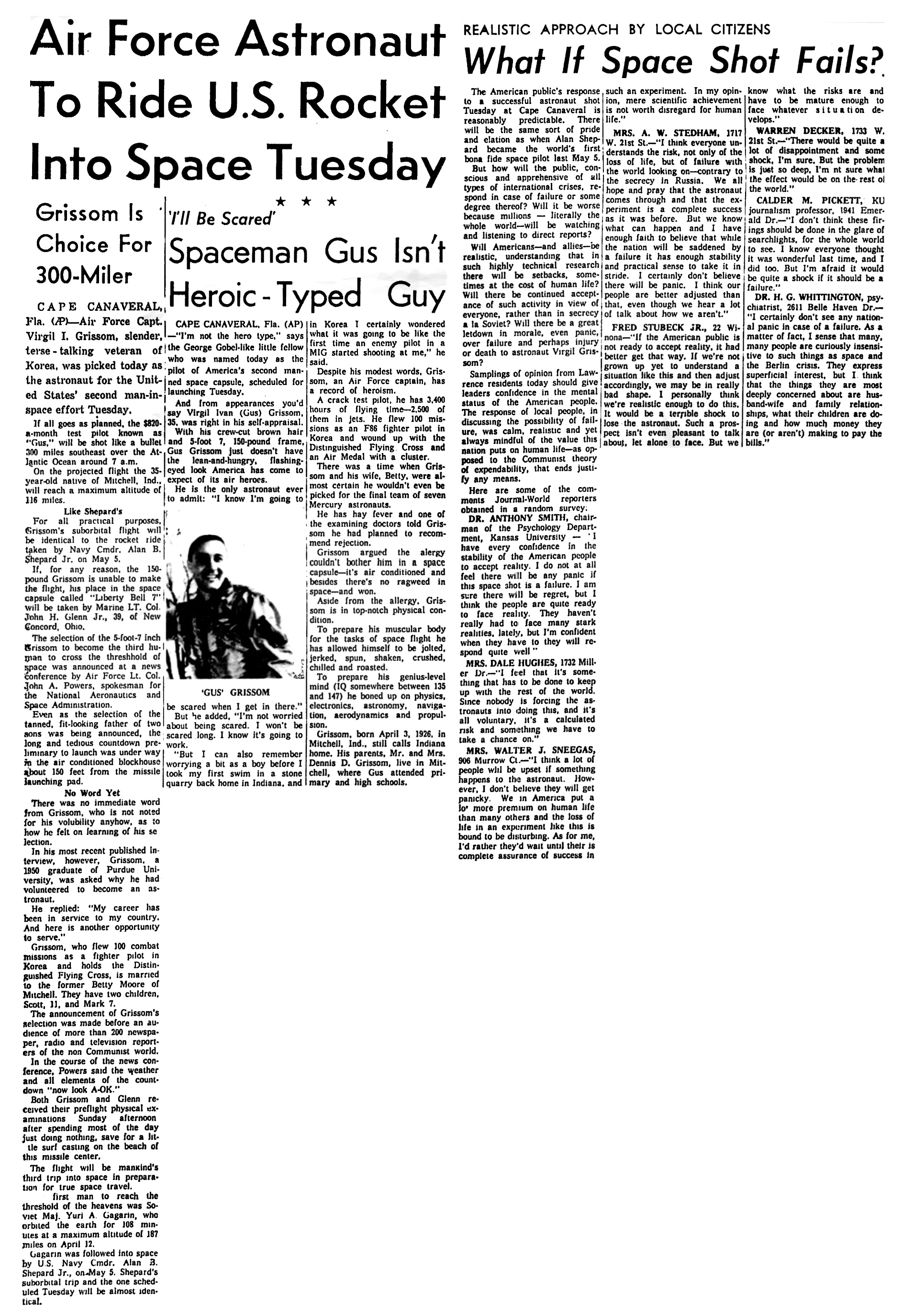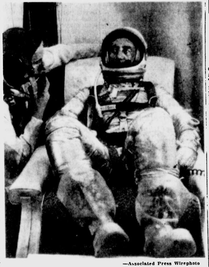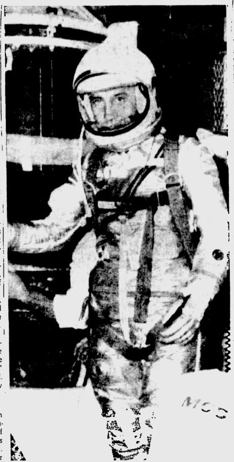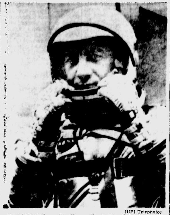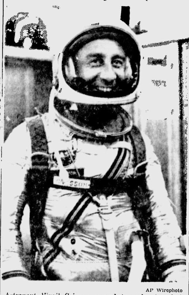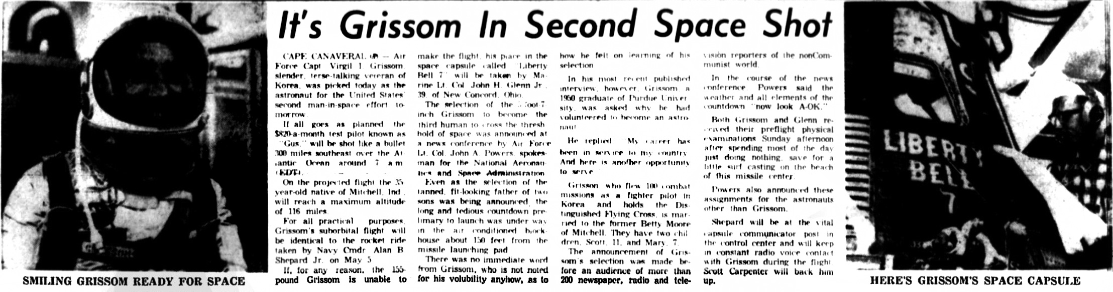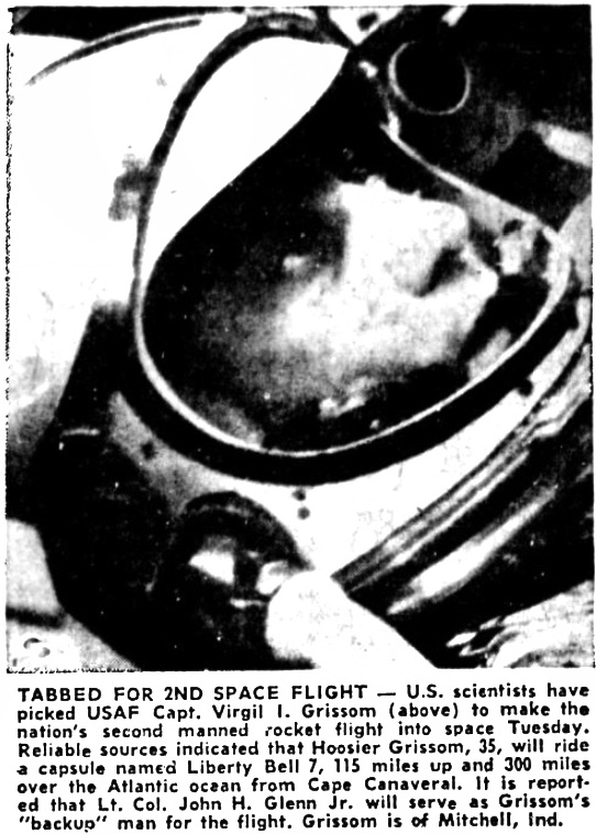 Ученые США выбрали капитана ВВС США Вирджила А. Гриссома (наверху) для совершения во вторник второго для страны пилотируемого ракетного полета в космос. Надежные источники указали, что 35-летний Гриссом полетит с мыса Канаверал в капсуле «Либерти Белл-7» на 115 миль вверх и на расстояние в 300 миль над Атлантическим океаном. Сообщается, что подполковник Джон Г. Гленн-младший выступит в качестве «запасного» человека для полета. Гриссом из Митчелла, штат Индиана.