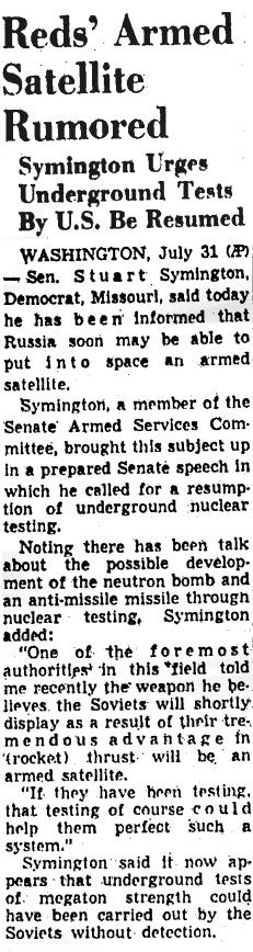 Вашингтон. Сенатор Стюарт Саймингтон, демократ от Миссури, сказал сегодня, что его проинформировали о возможном скором запуске советского вооруженного спутника.