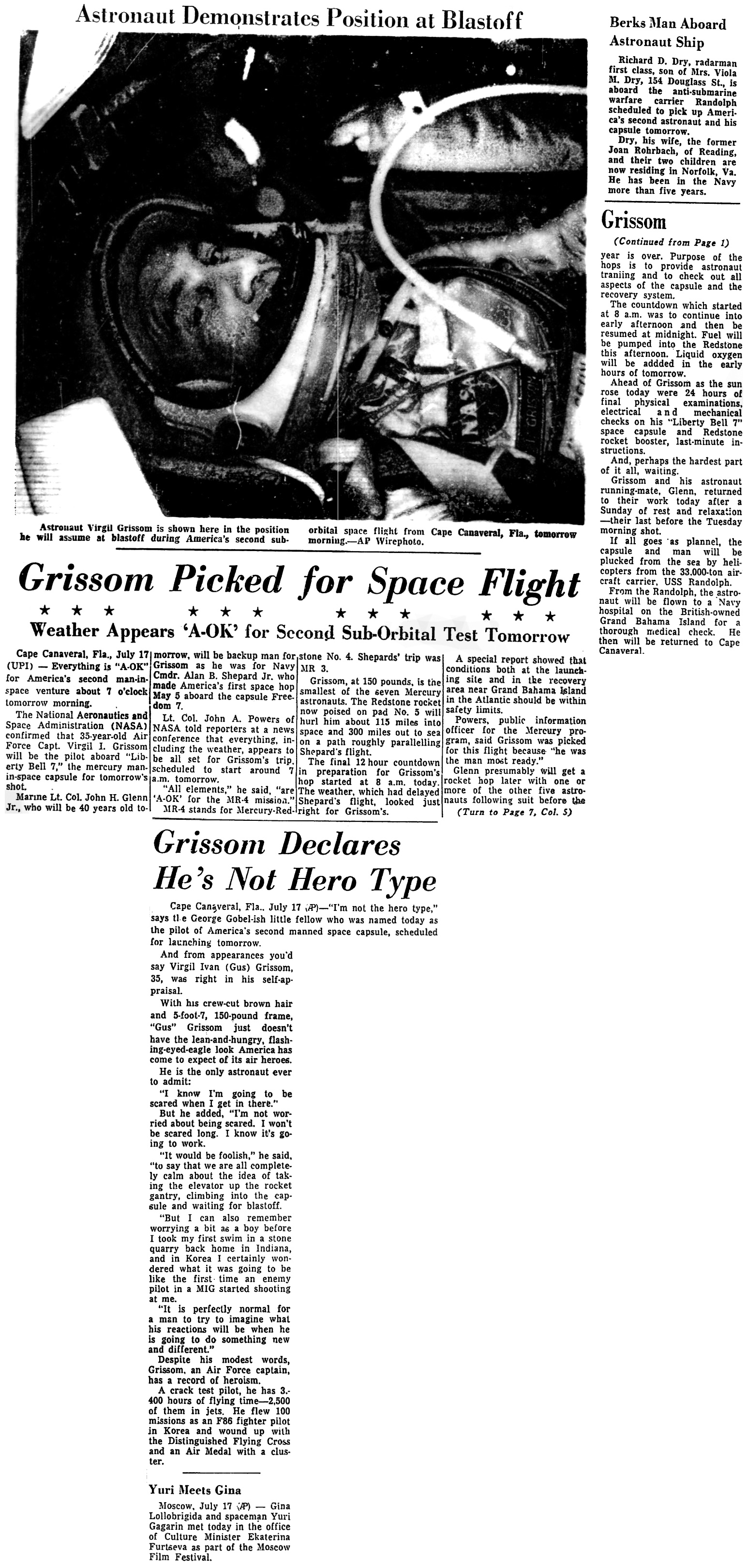 *Гриссом — следующий человек в космосе (сайт не открывается) (на англ.) «The Leader-Post», 17.07.1961