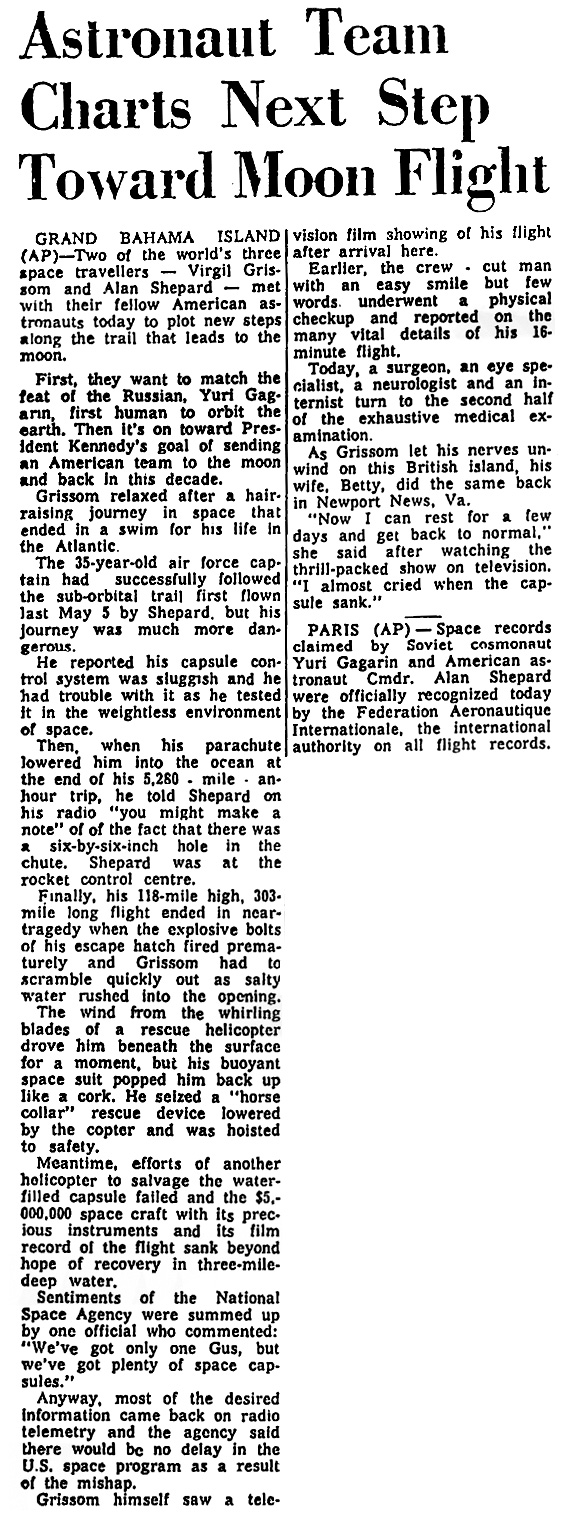 Таким образом сотрудник космического агентства, Марти Бернс, просуммировал вчера ситуацию после того, как капитан Вирджил А. (Гас) Гриссом успешно завершил свой сенсационный космический полет — только, чтобы омрачить его потерей своей капсулы под 16'800 футами воды.