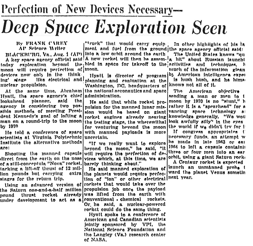 — *Испытание космической платформы отложено (Space Platform Test Postponed) (на англ.) «The Washington Observer», 2.08.1961 в jpg - 108 кб