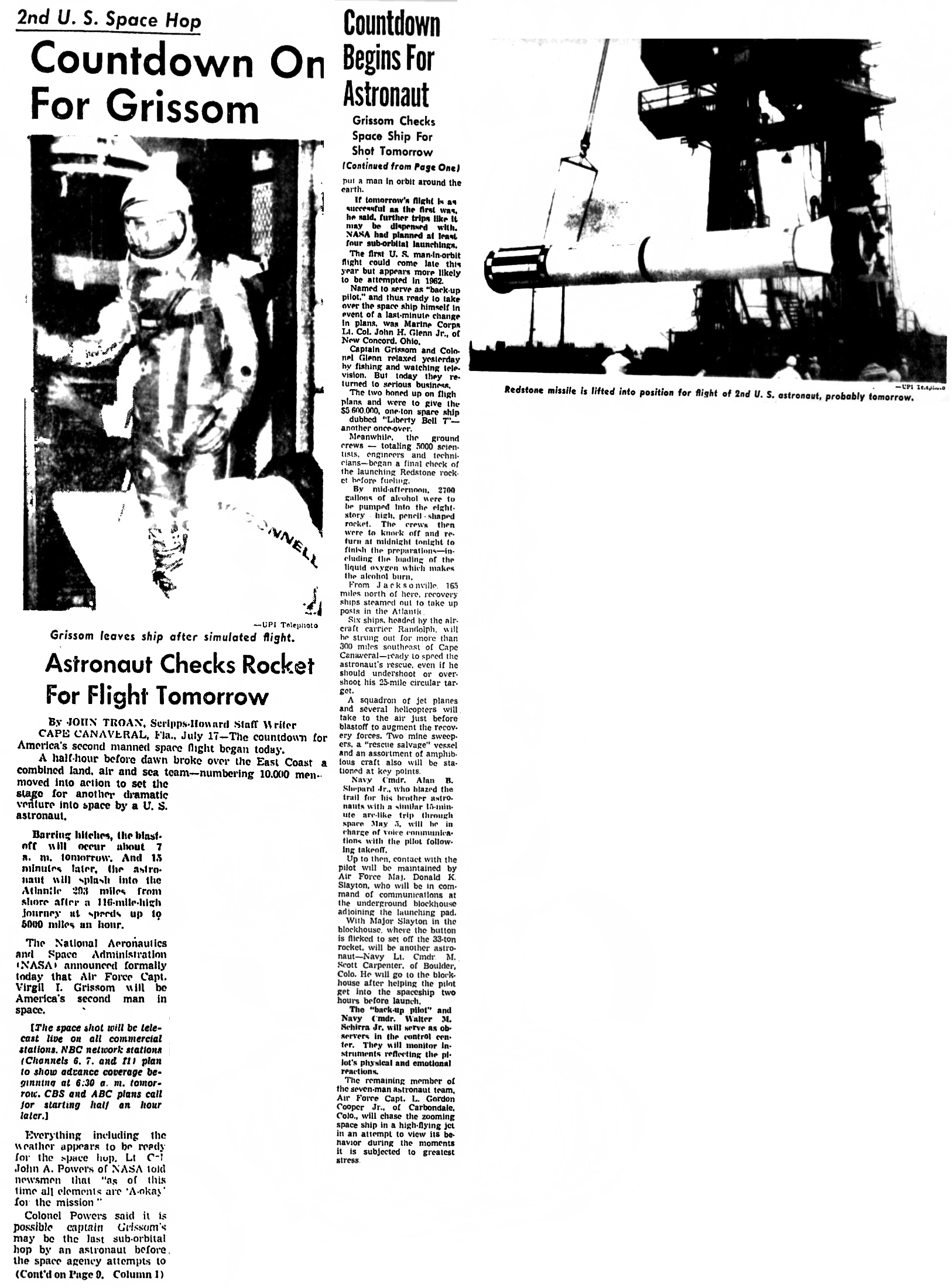 Мыс Канаверал, штат Флорида. Национальное управление по аэронавтике и исследованию космического пространства официально объявило сегодня, что капитан ВВС Вирджил А. Гриссом станет вторым американцем в космосе. Подполковник Джон Г. Гленн-младший станет астронавтом-дублером для ракетного скачка, запланированного на утро вторника.