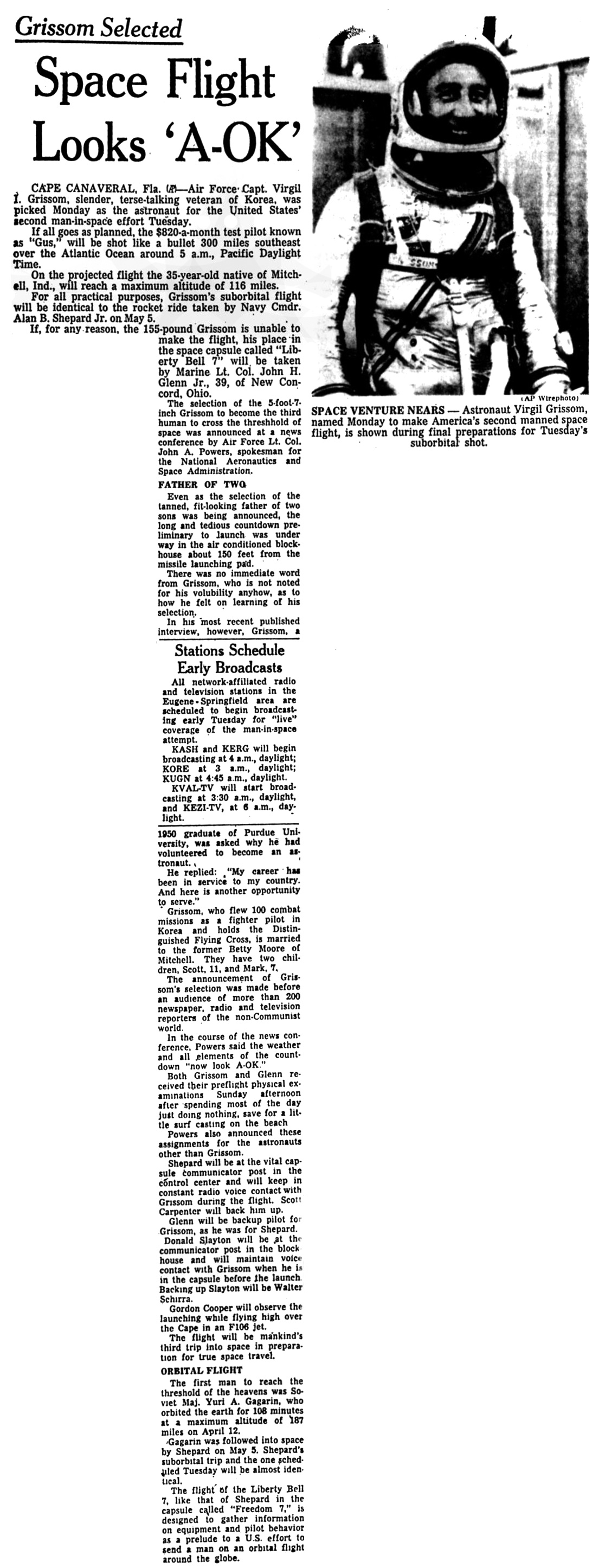 *Джон Троян. Гриссом разогревается для следующего космического запуска (сайт не открывается) (на англ.) «The Pittsburgh Press», 13.07.1961