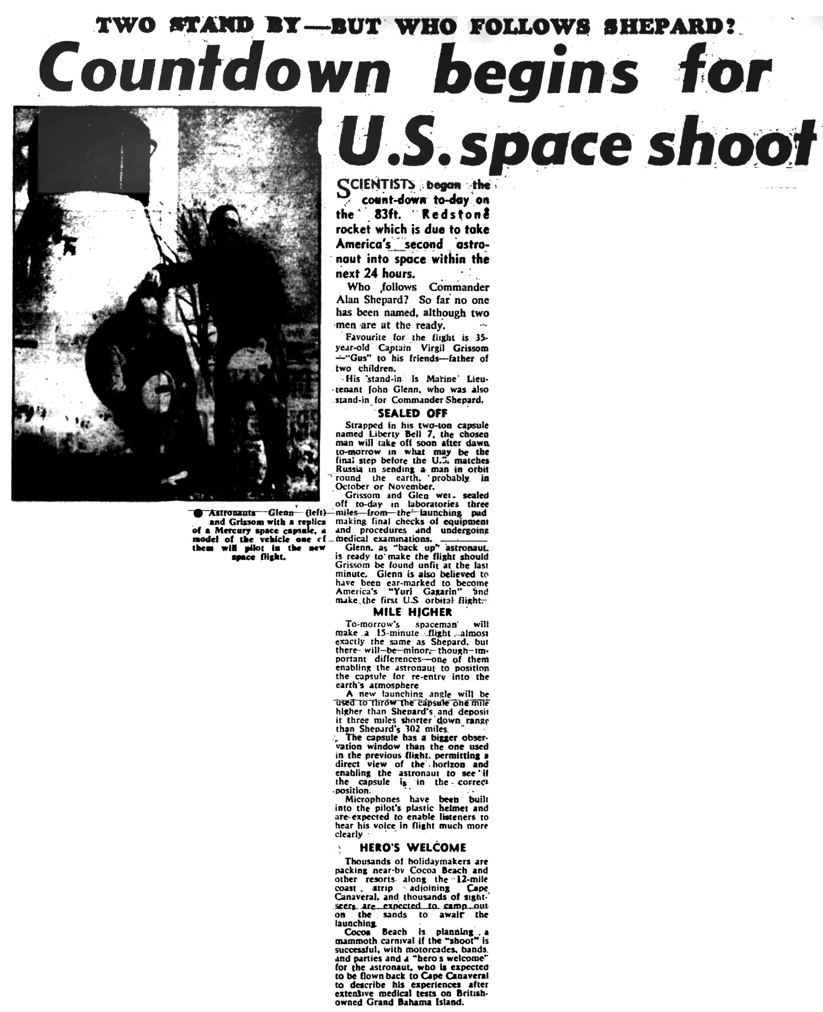 Как и в первом майском полете, подполковник морской пехоты Джон Х. Гленн из Кембриджа, штат Огайо, по-видимому выбран «запасным пилотом», готовым шагнуть вперед и совершить полет, если возникнут какие-либо перестановки в плане.