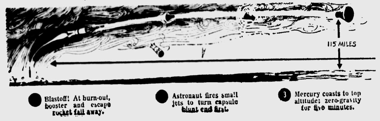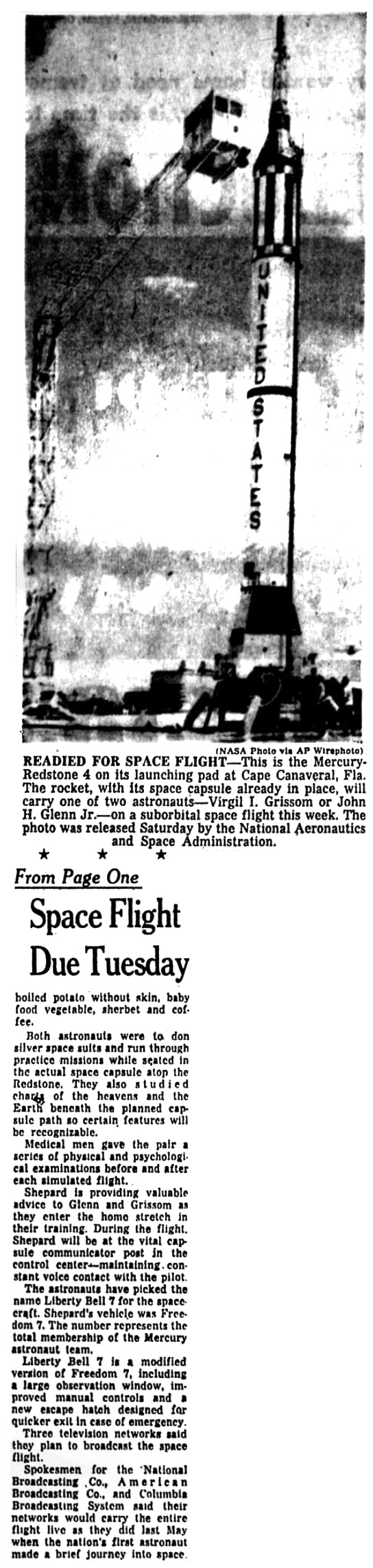 Пристегнутый в двухтонной капсуле «Либерти Белл-7», выбранный человек завтра вскоре после рассвета совершит финальный шаг перед тем, как США догонят СССР, отправив человека на орбиту вокруг Земли - вероятно в октябре, или в ноябре.