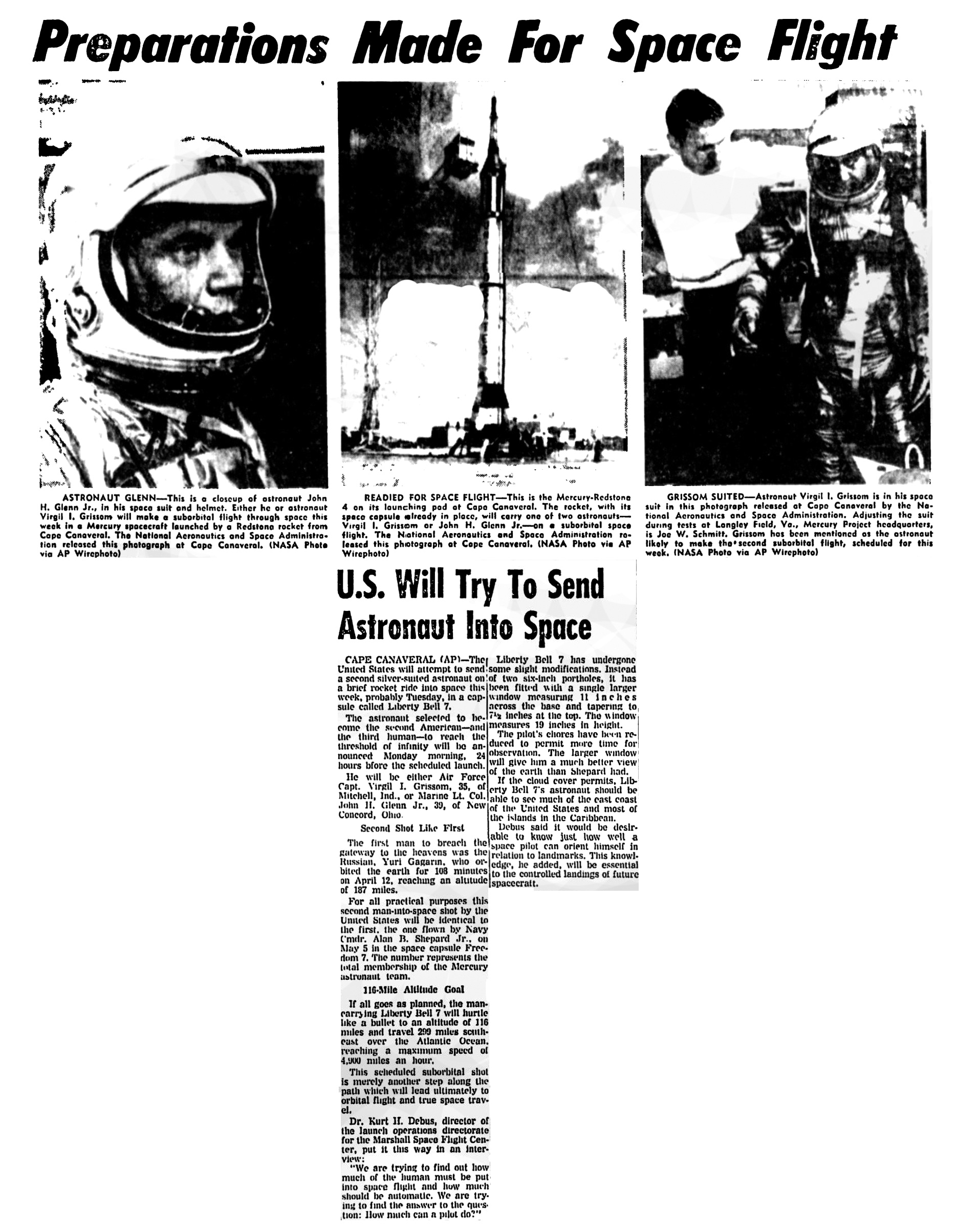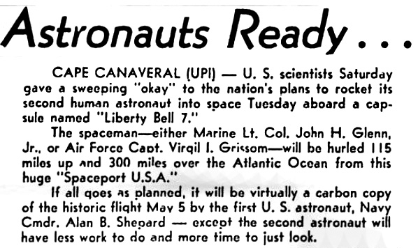 Второй из нескольких суборбитальных пусков программы проекта «Меркурий» попытается запустить человека на расстояние в 300 миль над Атлантическим полигоном с высотой полета более 100 миль и скоростями порядка 5'000 миль в час. Этим человеком станет либо подполковник морской пехоты Джон Гленн, который в возрасте 39 лет, ближе к 40, станет старейшим в мире астронавтом, или капитан Гас Гриссом, летчик-испытатель ВВС.