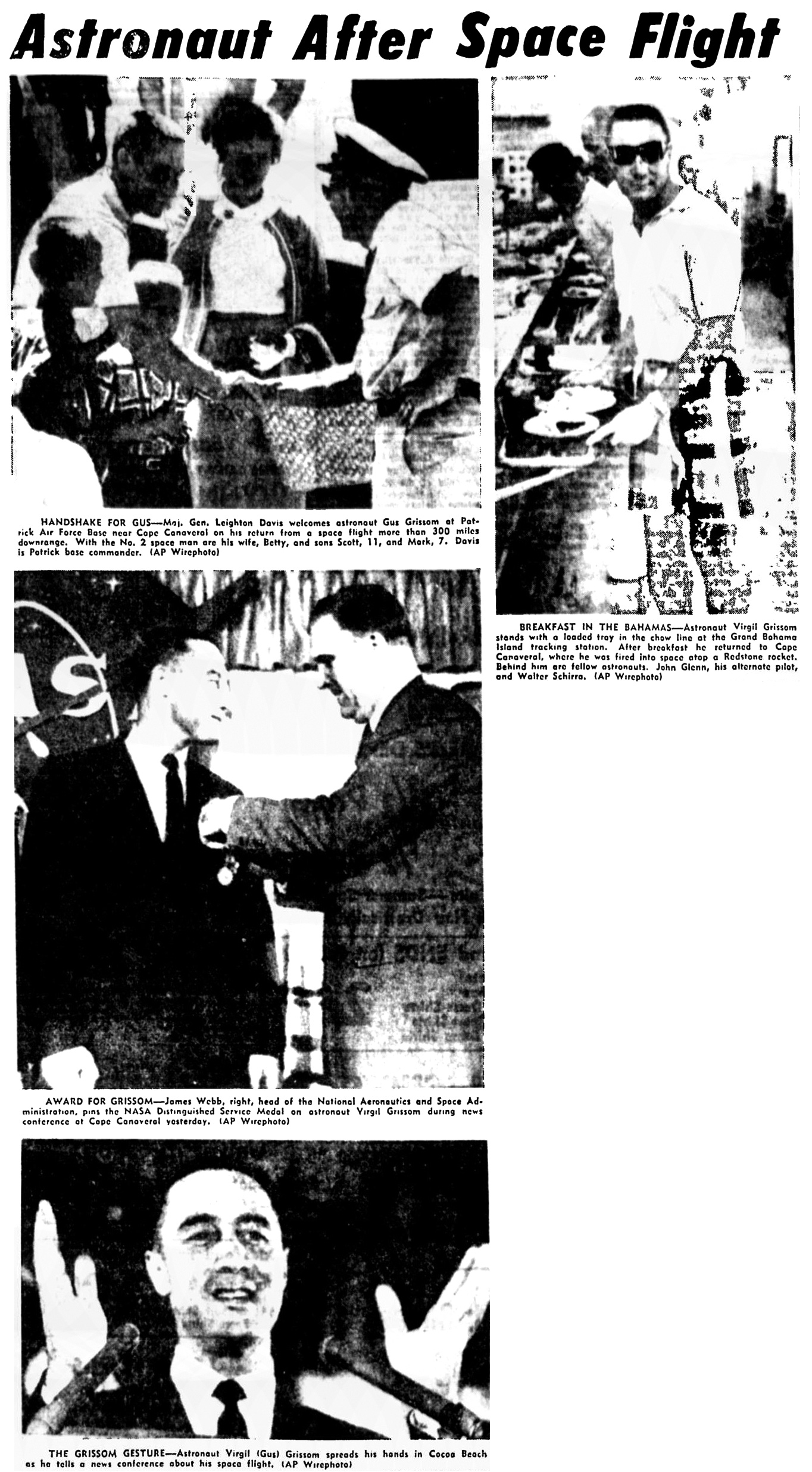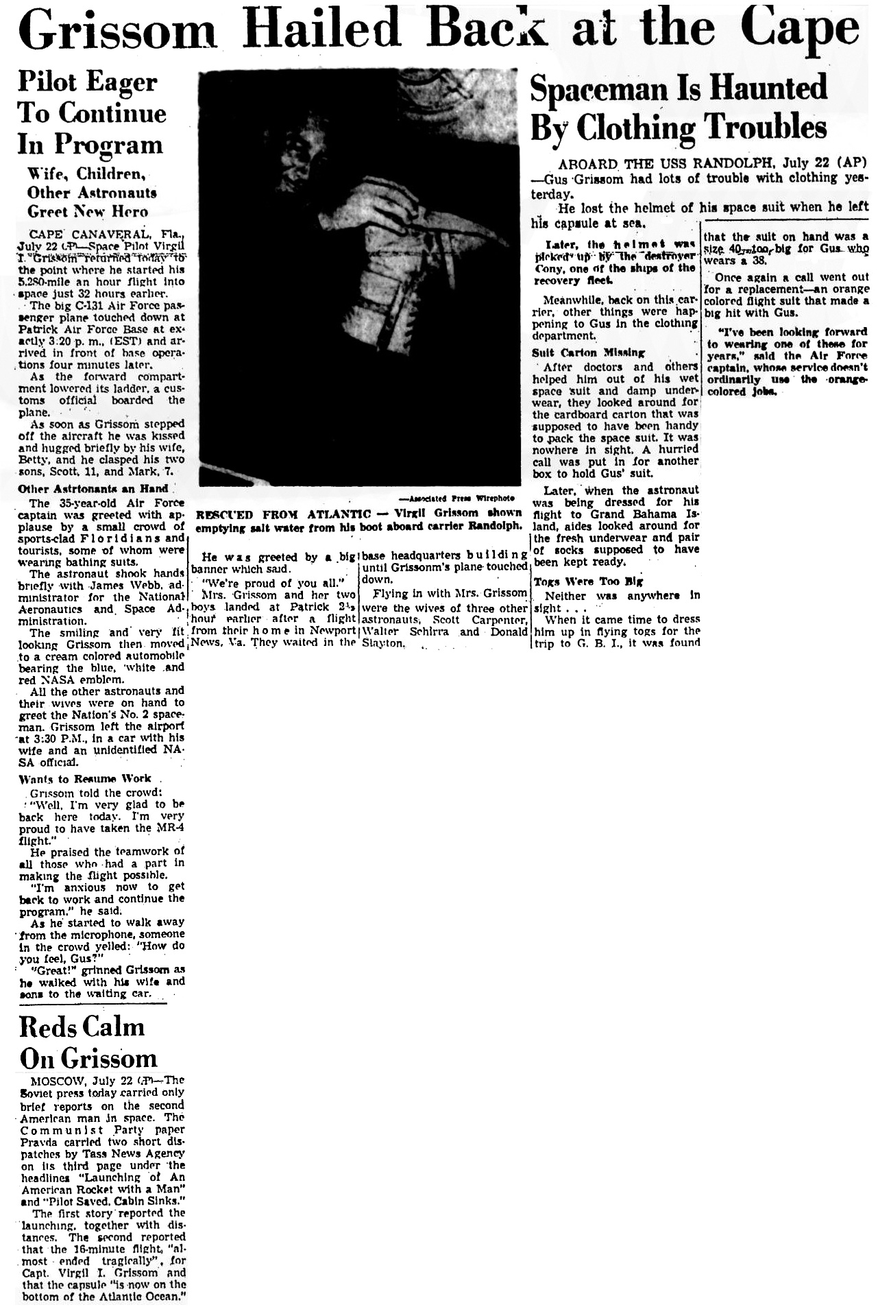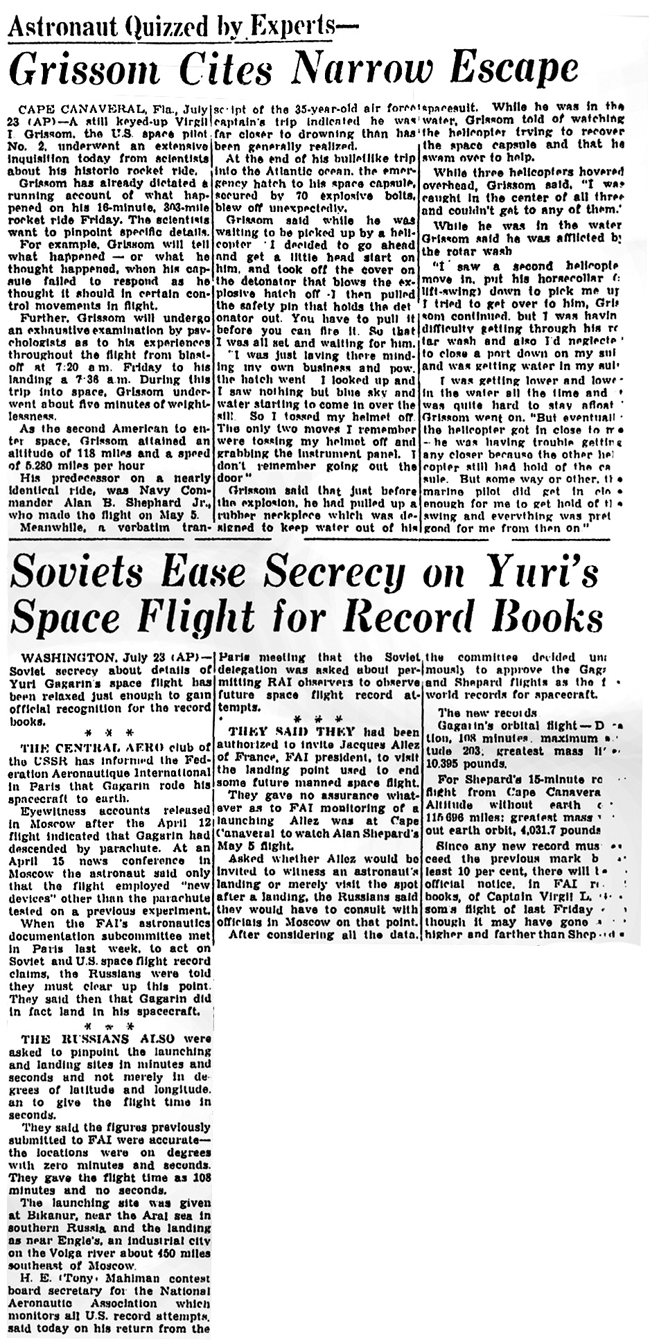 Первая заметка сообщила о запуске, а также сведения о расстояниях. Вторая рассказала, что 16-минутный полет «почти закончился трагически» для капитана Вирджила А. Гриссома, а также что капсула «теперь на дне Атлантического океана».