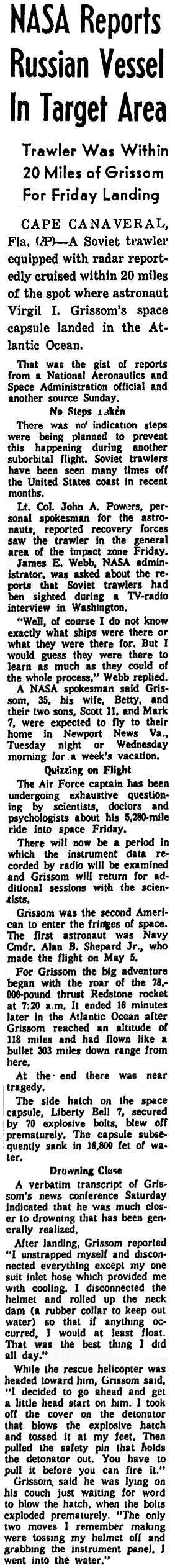 — *Гриссом рассказывает, как едва спасся (Grissom Citos Narrow Escape) (на англ.) «Schenectady Gazette», 24.07.1961 в jpg - 790 кб
