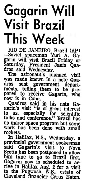 Рио-де-Жанейро, Бразилия. Советский космонавт Юрий А. Гагарин посетит Бразилию в пятницу или в субботу, сообщил президент Куадруш Жаниу.