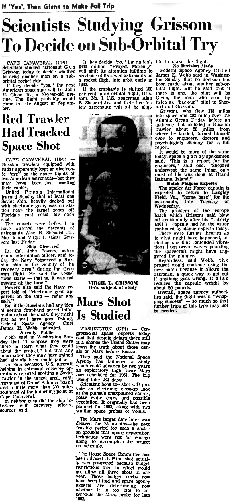 — *Ученые изучают Гриссома, чтобы принять решение по поводу суборбитальной попытки (Scientists Studying Grissom To Decide on Sub-Orbital Try) (на англ.) «Middlesboro Daily News», 24.07.1961 в jpg - 585 кб