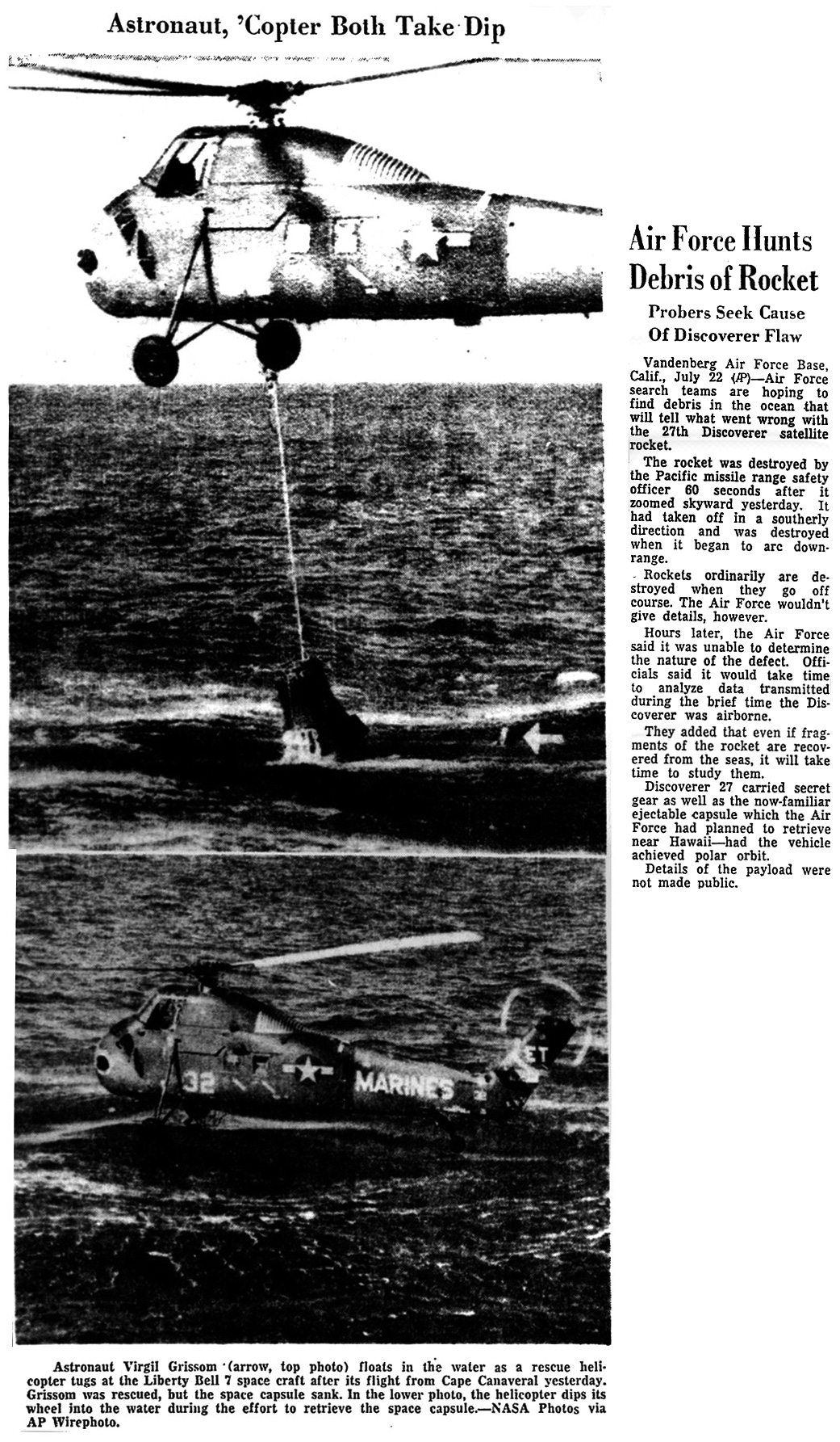 Астронавт Вирджил Гриссом (стрелка на верхней фотографии) плавает в воде, пока спасательный вертолет тянет космический аппарат «Либерти Белл-7» после совершенного вчера полета с мыса Канаверал. Гриссом был спасен, но космическая капсула утонула. На нижнем снимке вертолет колесами погрузился в воду, пытаясь спасти космическую капсулу.