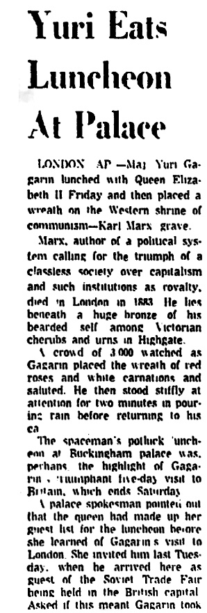*Советский астронавт беседует с королевой за обедом (сайт не открывается) (на англ.) «The Press-Courier», 14.07.1961