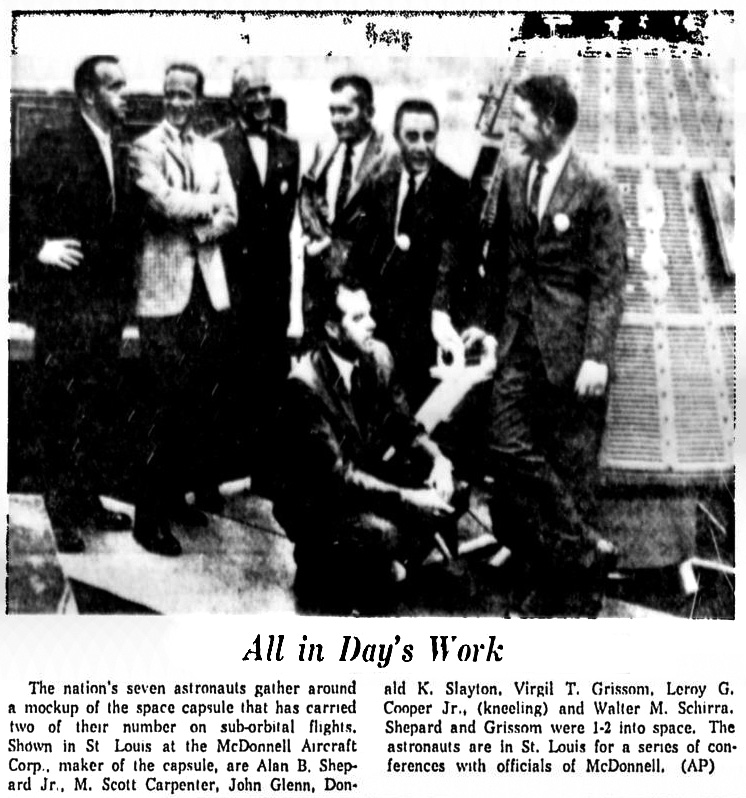 Семеро астронавтов страны собрались вокруг макета космической капсулы, которая отправила двух из них в суборбитальные полеты. В Сент-Луис на предприятие корпорации «МакДоннелл Эйркрэфт» прибыли: Алан Б. Шепард-младший, М. Скотт Карпентер, Джон Гленн, Дональд К. Слейтон, Вирджил Т. Гриссом, Лерой Г. Купер-младший (сидит) и Уолтер М. Ширра. Шепард и Гриссом стали первым и вторым номером в космосе. Астронавты находятся в Сент-Луисе для серии совещаний с официальными лицами корпорации.