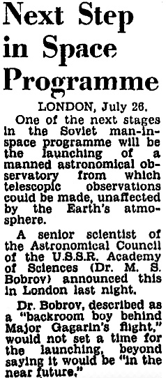 Лондон. Одним из следующих этапов советской пилотируемой космической программы станет запуск обитаемой астрономической обсерватории с которой могут вестись телескопические наблюдения, неподверженные воздействию атмосферы Земли.