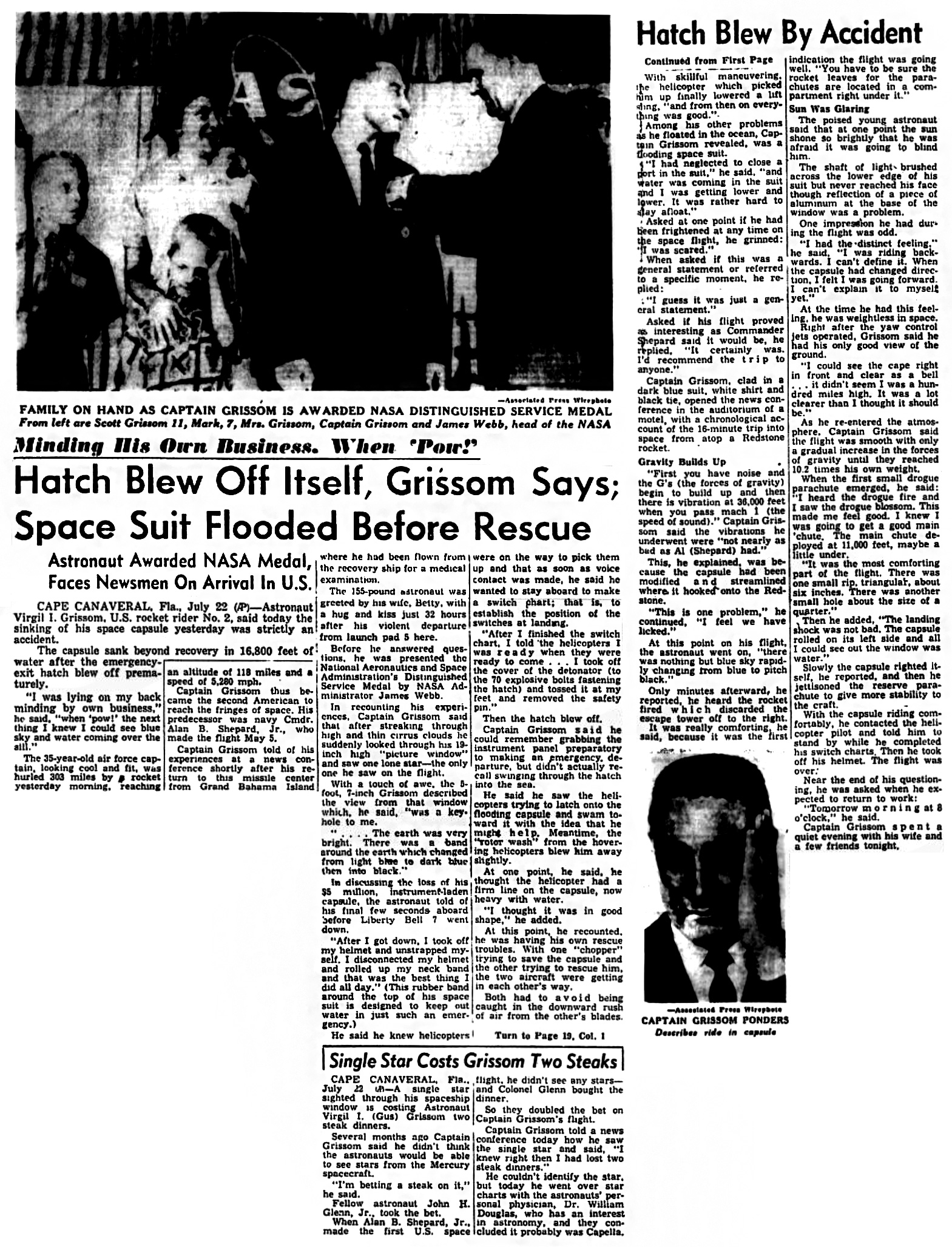 Капитан Гриссом, одетый в темно-синий костюм, белую рубашку и черный галстук, начал пресс-конференцию в зале гостиницы с хронологического перечисления событий его 16-минутного полета в космос наверху ракеты «Редстоун».