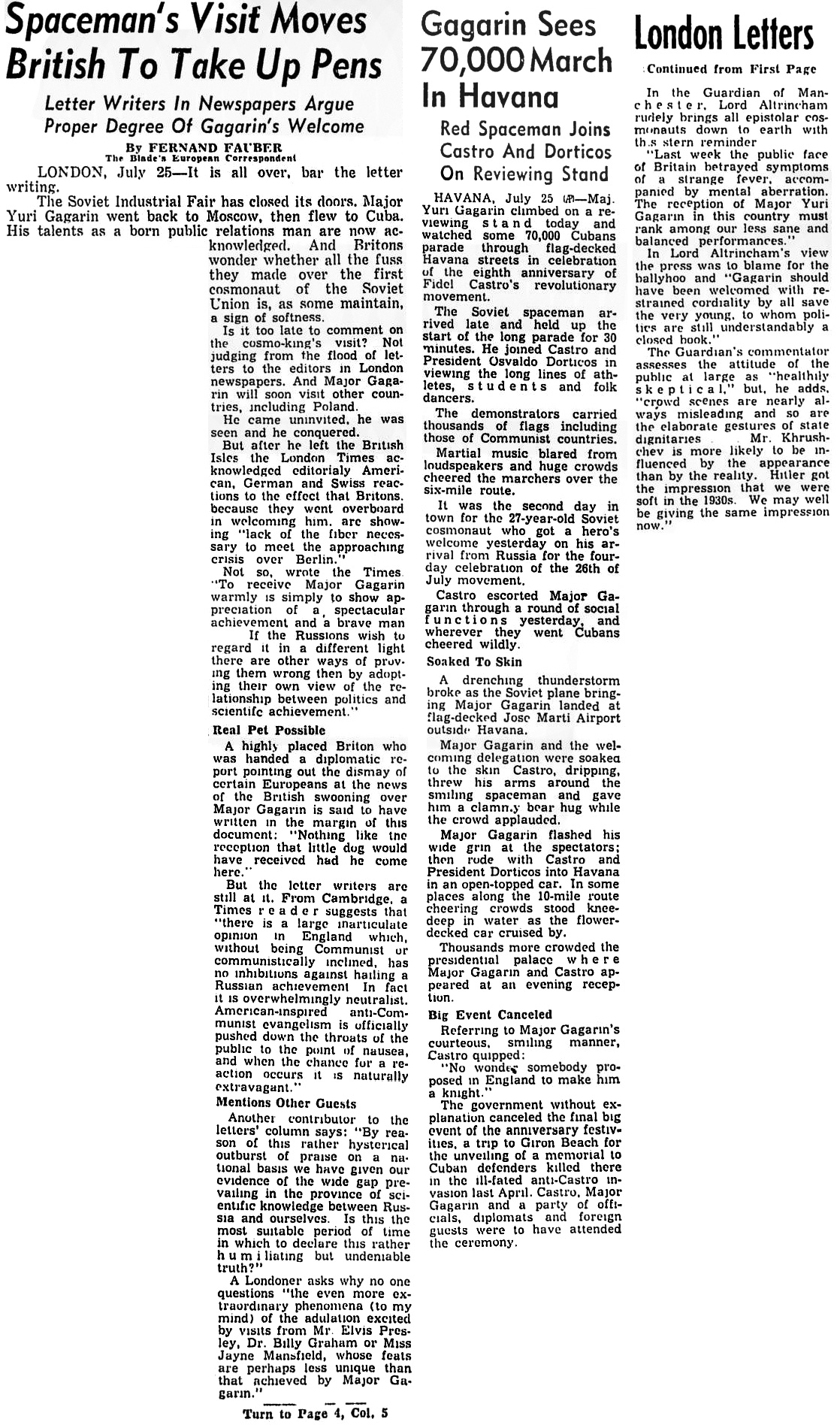 Гандер, Ньюфаундленд. Советский космонавт майор Юрий Гагарин, совершая свой первый визит в «Новый мир», сегодня улетит на Кубу, где его встретят с красным ковром — церемония, обычно приберегаемая для глав государств.