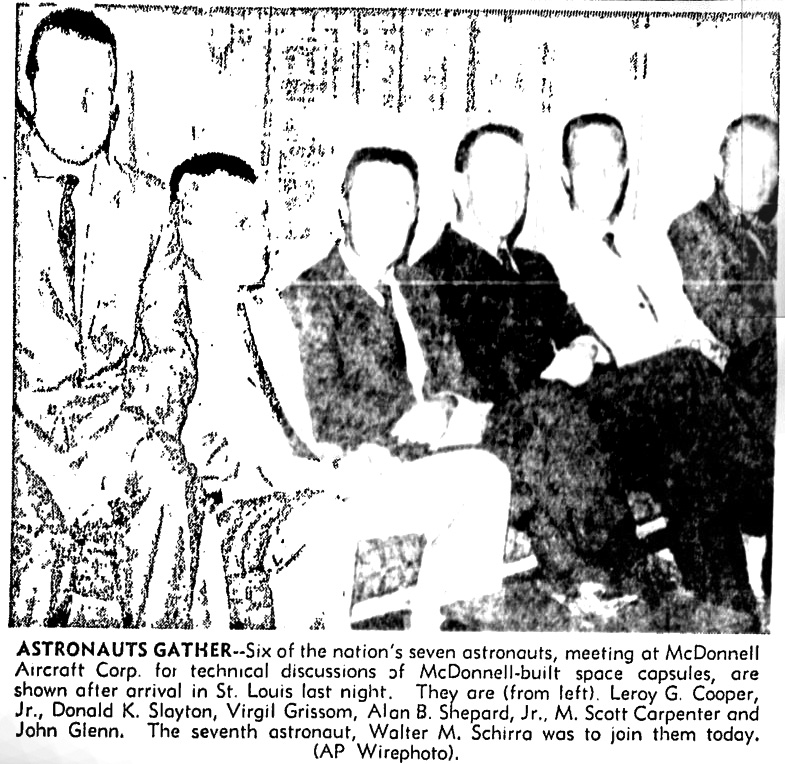 Шестеро из семи астронавтов страны, собравшиеся в корпорации «МакДоннелл Эйркрэфт» для обсуждения технических вопросов относительно построенных корпорацией космических капсул, показаны после прибытия в Сент-Луис прошлым вечером. На снимке (слева направо) Лерой Купер-младший, Дональд К. Слейтон, Вирджил Гриссом, Алан Б. Шепард-младший, М. Скотт Карпентер и Джон Гленн. Седьмой астронавт, Уолтер М. Ширра, должен присоединиться к ним сегодня.