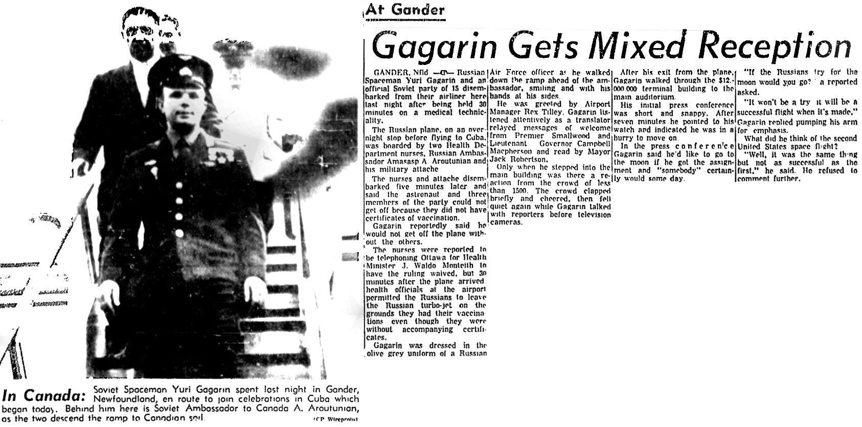 — *Гандер. Неоднозначная встреча Гагарина (Gagarin Gets Mixed Reception) (на англ.) «The Gazette» (Монреаль), 24.07.1961 в jpg - 373 кб