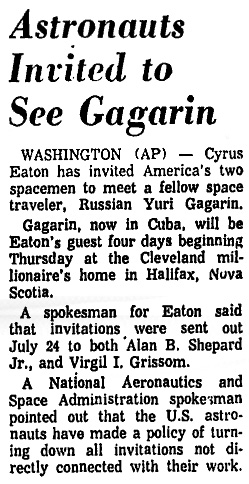 Галифакс. Кливлендский промышленник Сайрус Итон пригласил двух космонавтов Соединенных Штатов прибыть сюда на следующей неделе для встречи с советским астронавтом Юрием Гагариным.