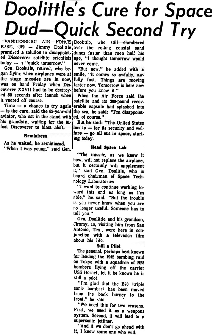 База ВВС Ванденберг. Джимми Дулиттл пообещал сегодня решение для разочарованных ученых спутникового проекта «Дискаверер» - «быстро и завтра».