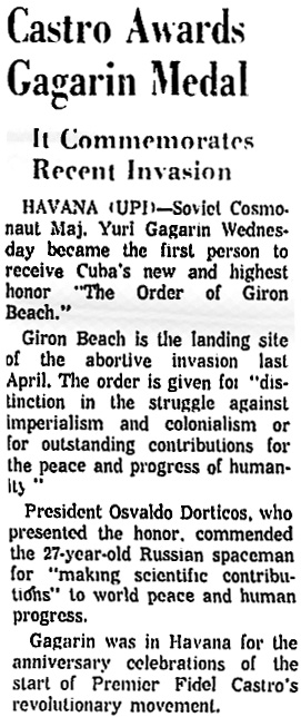 — *Кастро наградил Гагарина медалью (Castro Awards Gagarin Medal) (на англ.) «The Washington Reporter», 27.07.1961 в jpg - 84 кб