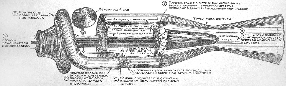 После этого всосанный воздух смешивается с жидким топливом, подвергается сжатию в импеллере турбинной конструкции, далее поступает в камеру сгорания и, расширяясь под влиянием тепла, с силой и большой скоростью выталкивается через форсунки или патрубки, расположенные в задней кромке несущих плоскостей или в хвостовой части фюзеляжа.