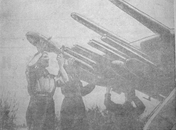 Некоторое время назад в составе лондонской противовоздушной обороны появились батареи ракетных орудий, с успехом защищающие английское небо от немецких налетчиков. На восточном фронте эскадрильи советских штурмовиков с бреющего полета уничтожают ракетными снарядами немецкие танки. (В свою очередь немцы угрожают Лондону применением «V-2» — одного из типов ракетного снаряда.