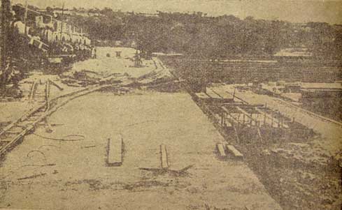 ![]() Часть стартовой платформы малого типа. Искусственный травяной покров снят. Внизу — главная стартовая платформа, от которой под прямым углом отходит ответвление; слева видны бетономешалки ![]() |