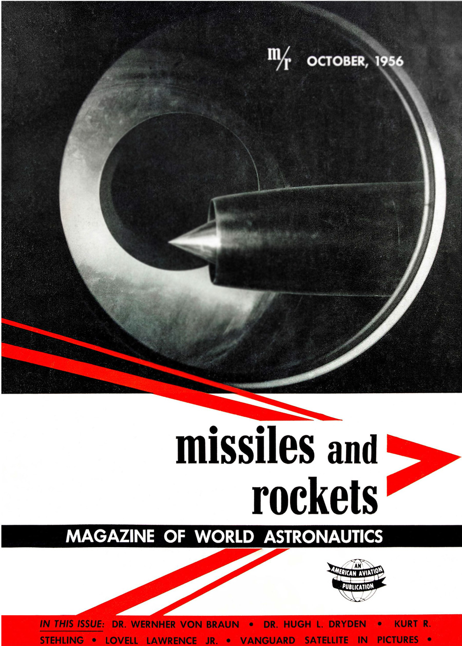 на обложке - Обширные ракетные исследования в туннеле сверхзвукового давления NACA размером 4 х 4 фута в Лэнгли. Авиационная лаборатория предоставила значительный объем данных для отрасли. Тот факт, что NACA активно занимается ракетными исследованиями, не получил широкой огласки; Missiles & Rockets попросили доктора Хью Л.Драйдена рассказать о роли НАСА в этом отношении. Его статья опубликована на странице 44.
