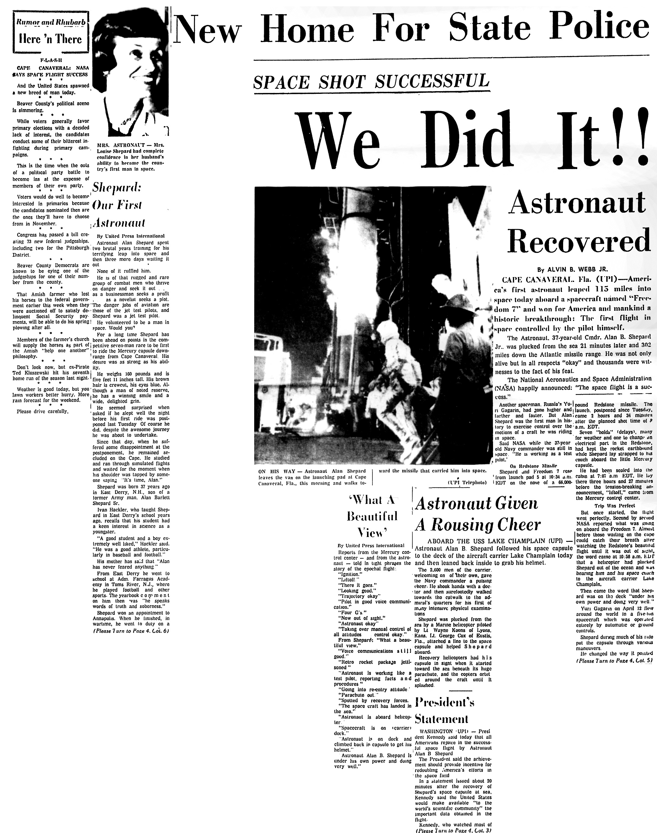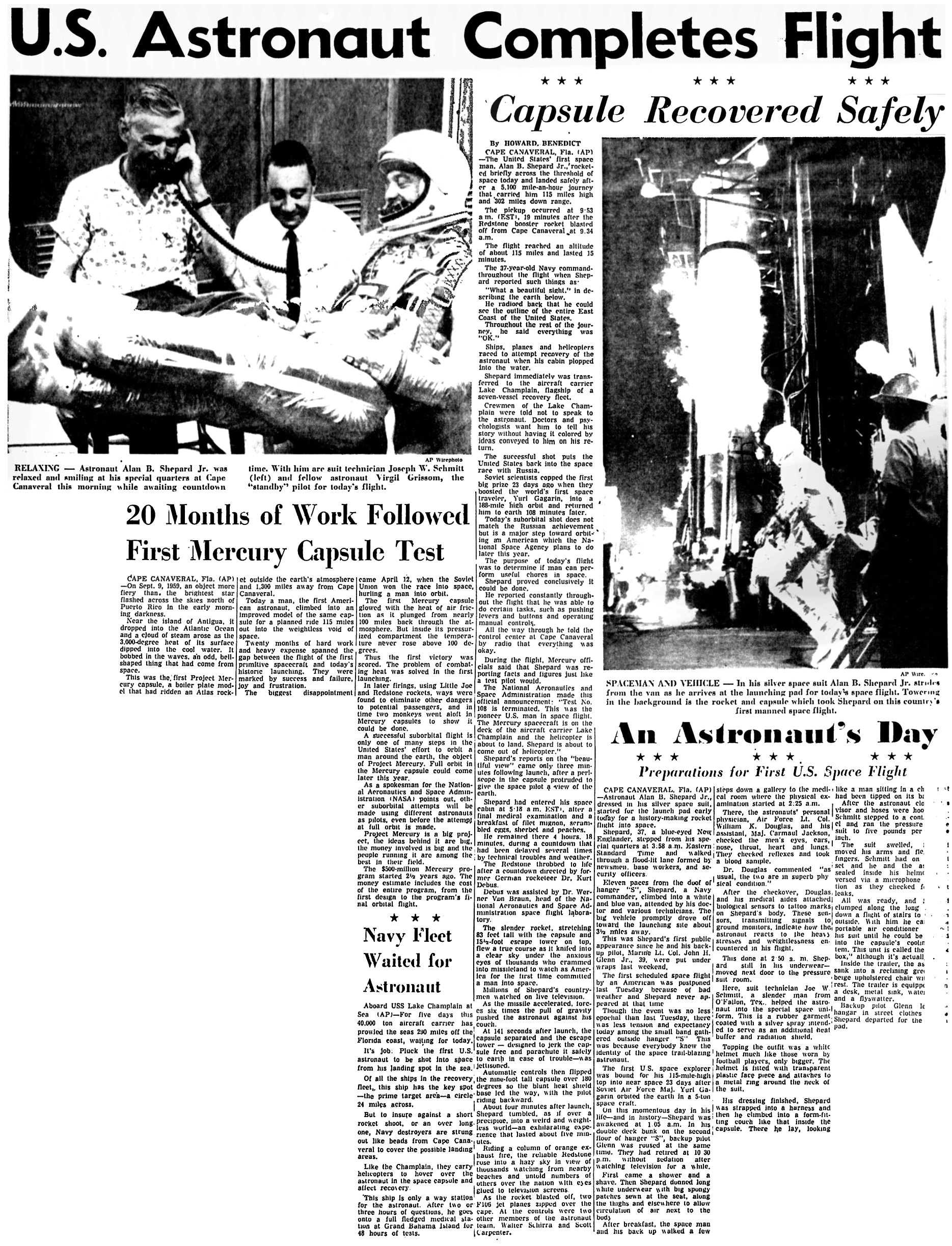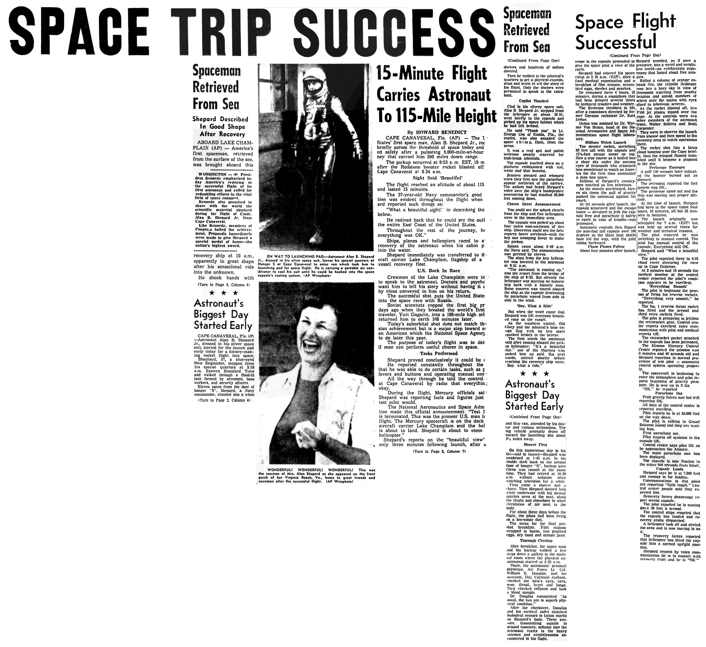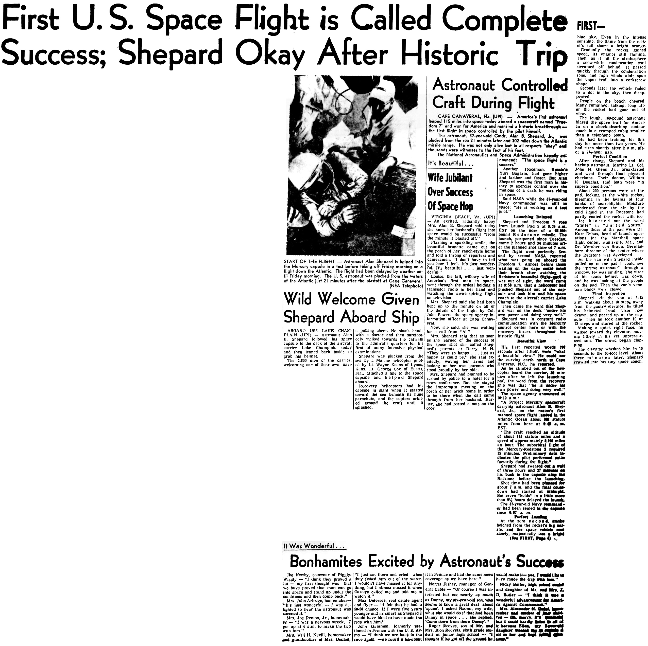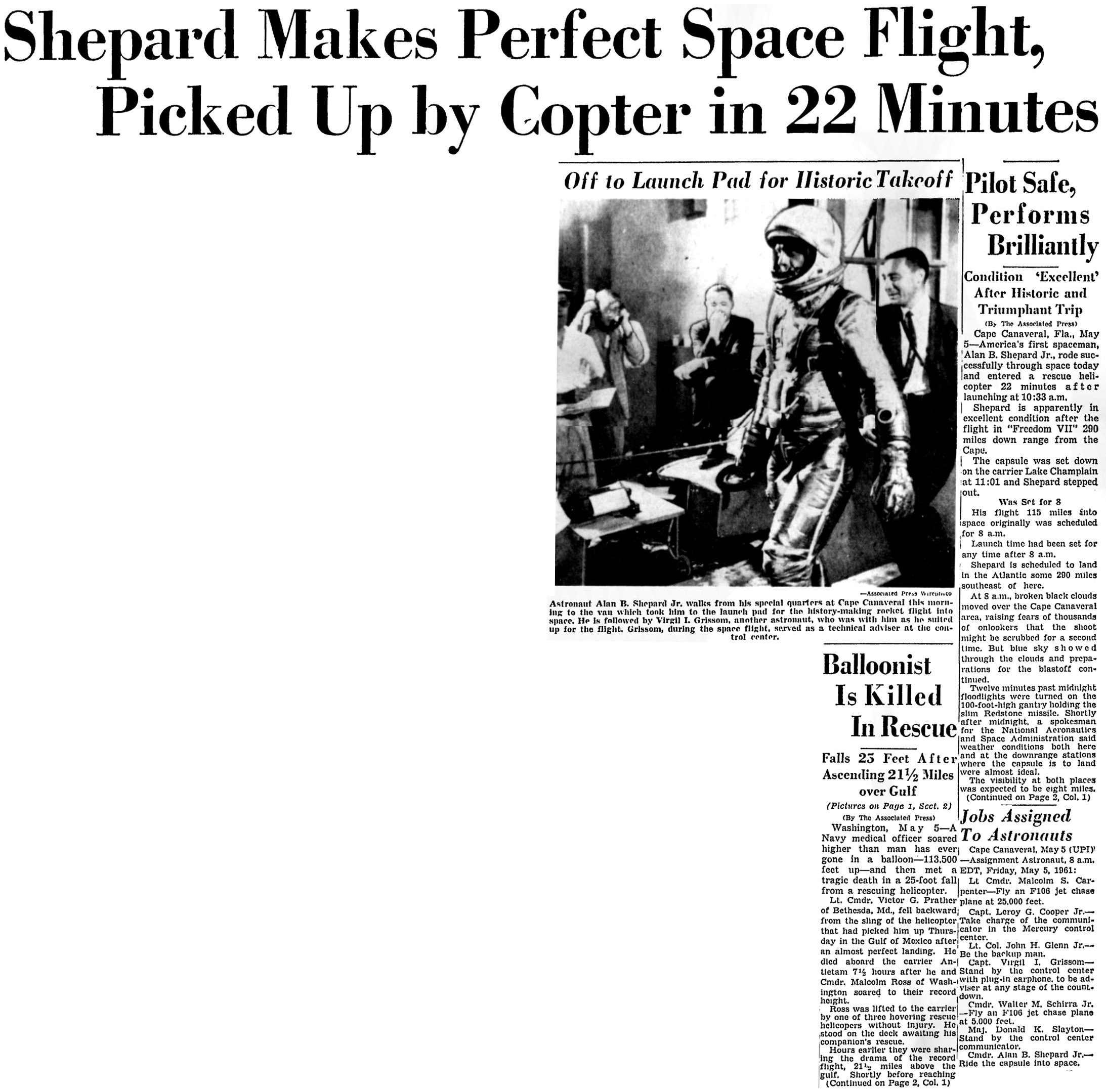 «Согласно информации, полученной с мыса Канаверал, была запущена ракета с человеком на борту. Через 15 минут, капсула с пилотом, Аланом Шепардом, упала в Атлантический океан на расстоянии 300 миль от мыса Канаверал».