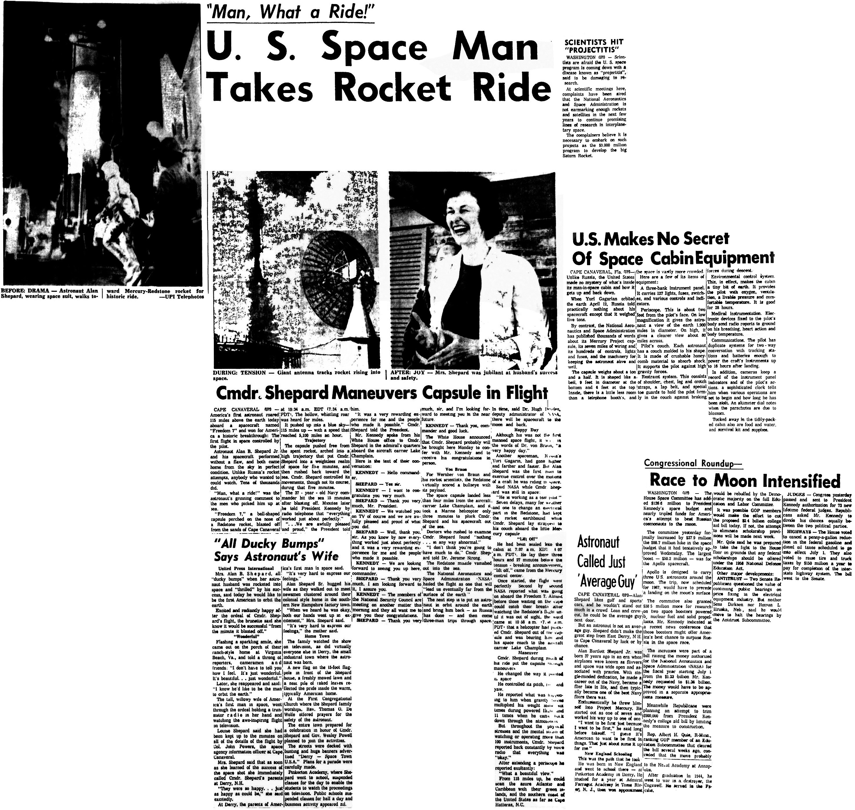 - *Астронавта защищают многочисленные меры предосторожности (Many Safety Aids Protect Astronaut) (на англ.) «The Spartanburg Herald», 5.05.1961 в jpg — 884 кб