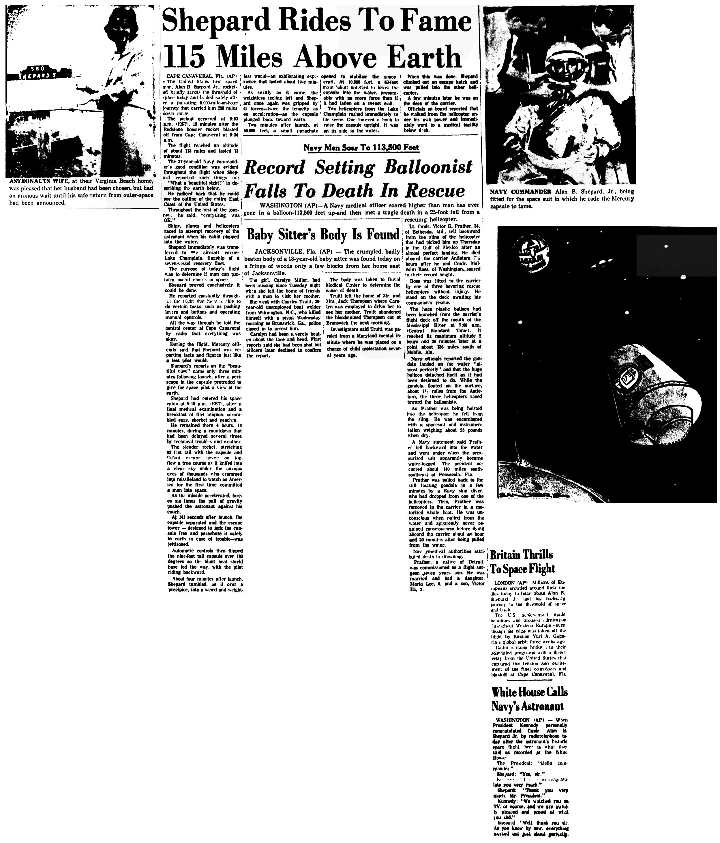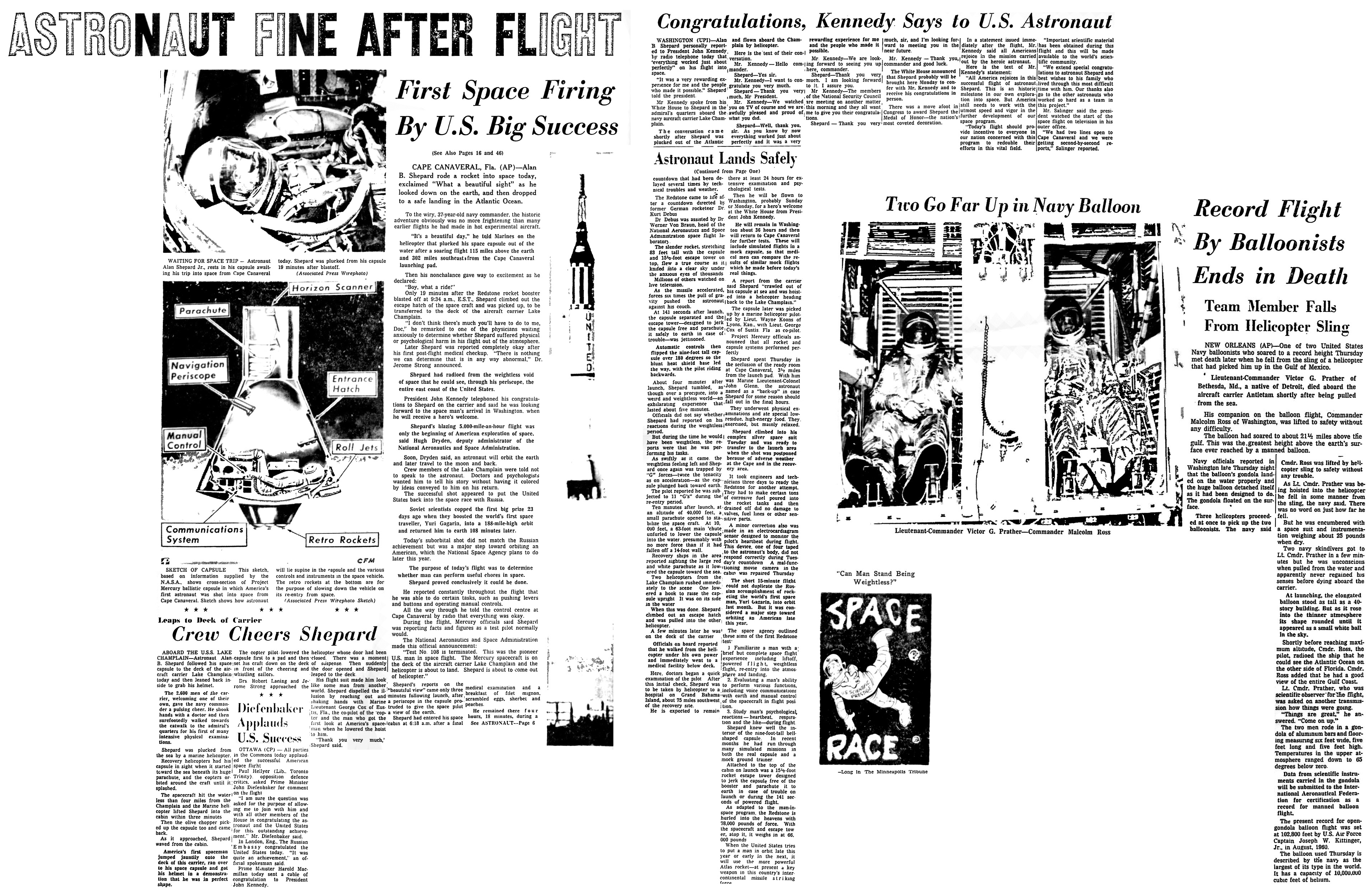 Мыс Канаверал, штат Флорида. Алан Б. Шепард слетал сегодня на ракете в космос, воскликнул «Какой прекрасный вид», поглядев вниз на Землю, а затем упал для благополучной посадки в Атлантическом океане.