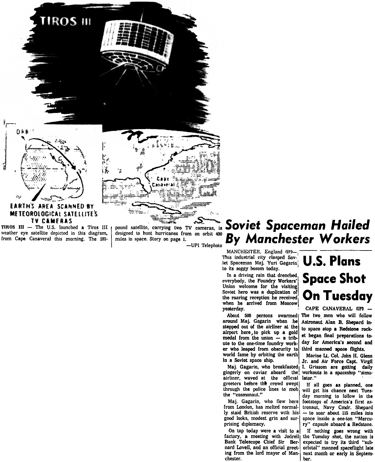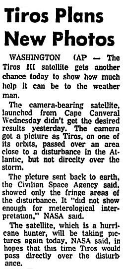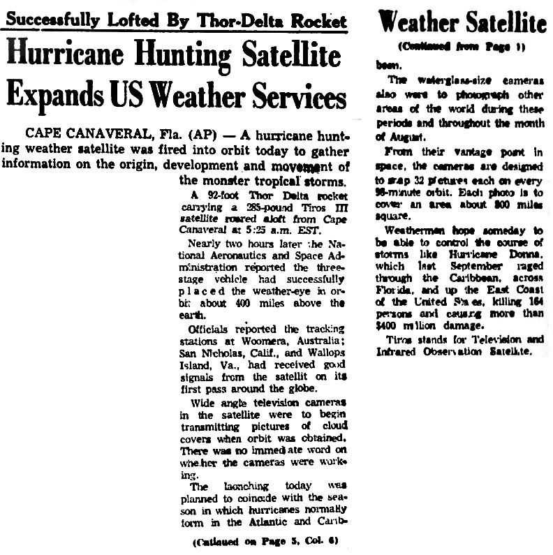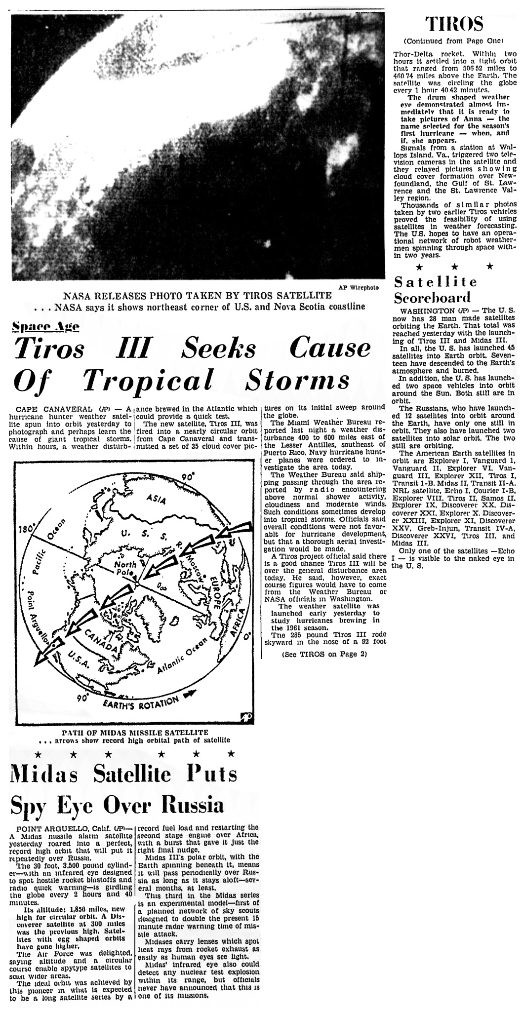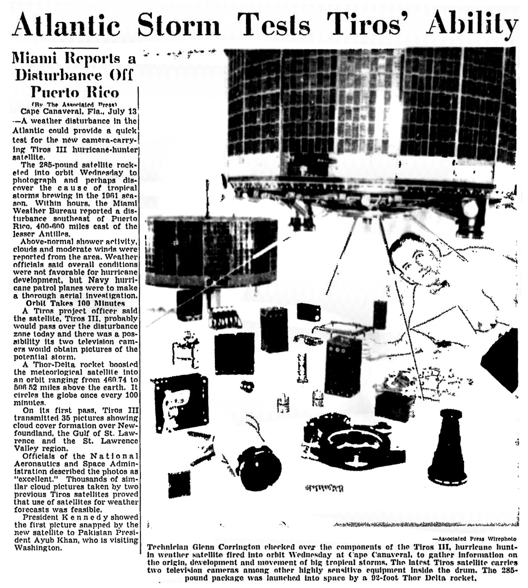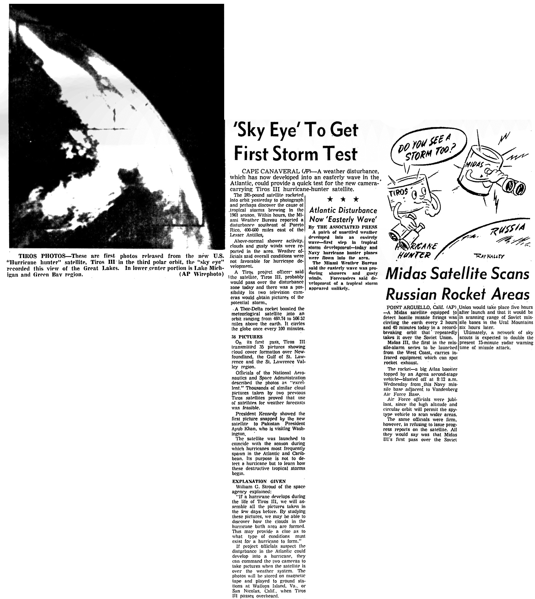 - *Спутник «Тирос» передает вторую фотографию шторма (сайт не открывается) (на англ.) «Schenectady Gazette», 15.07.1961