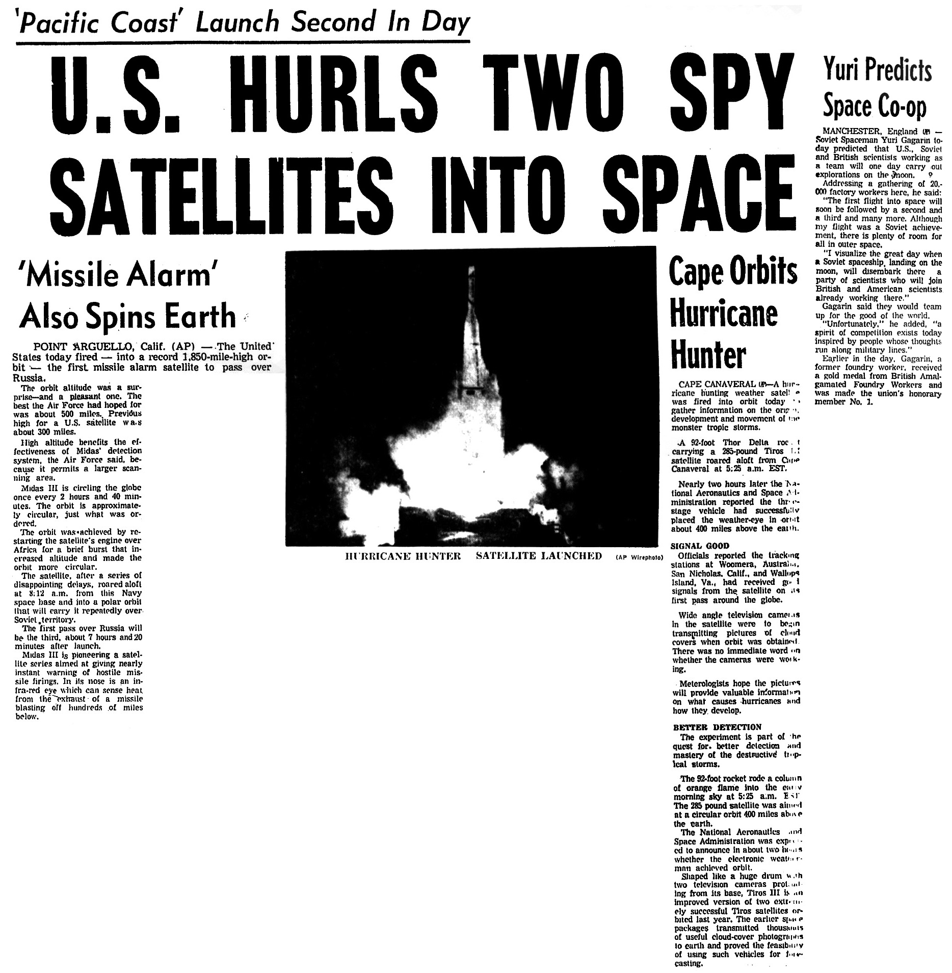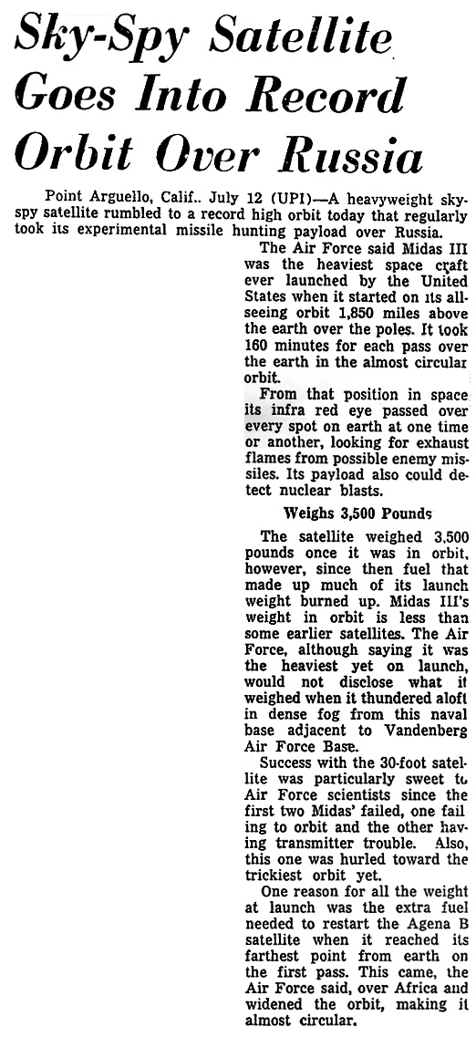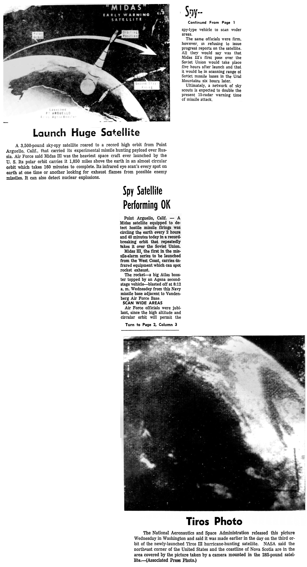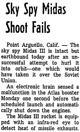 Пойнт-Аргуэлло. ВВС отменили в воскресенье попытку запуска шпионского спутника «Мидас-3» после того, как обратный отсчет дошел до нуля. Отмена никак не объясняется и дата нового запуска не объявлена.