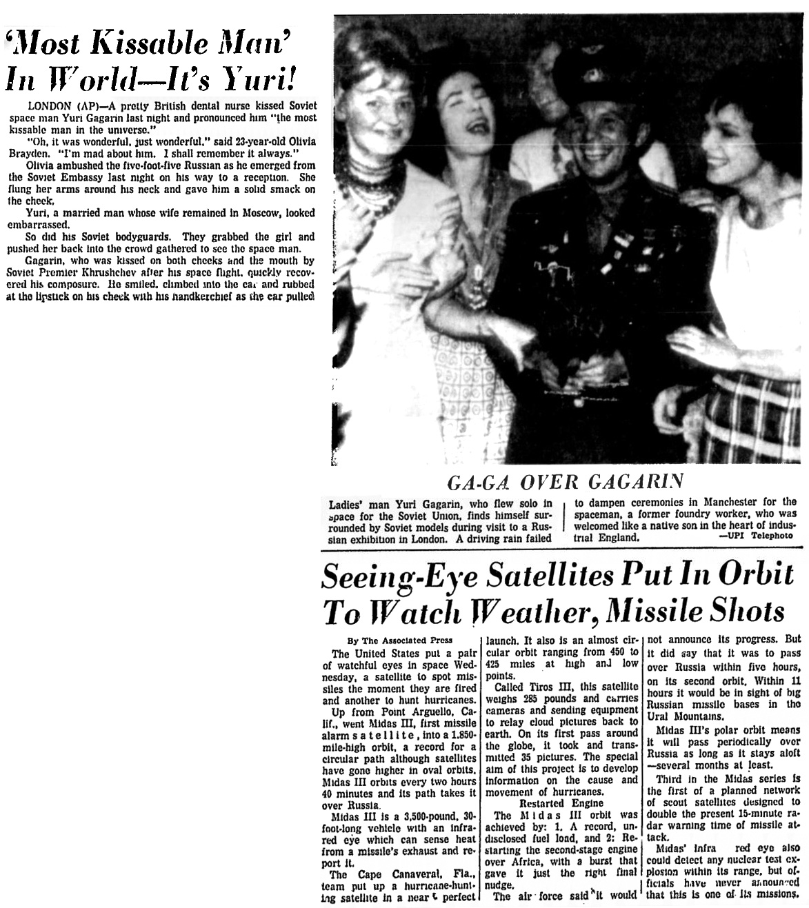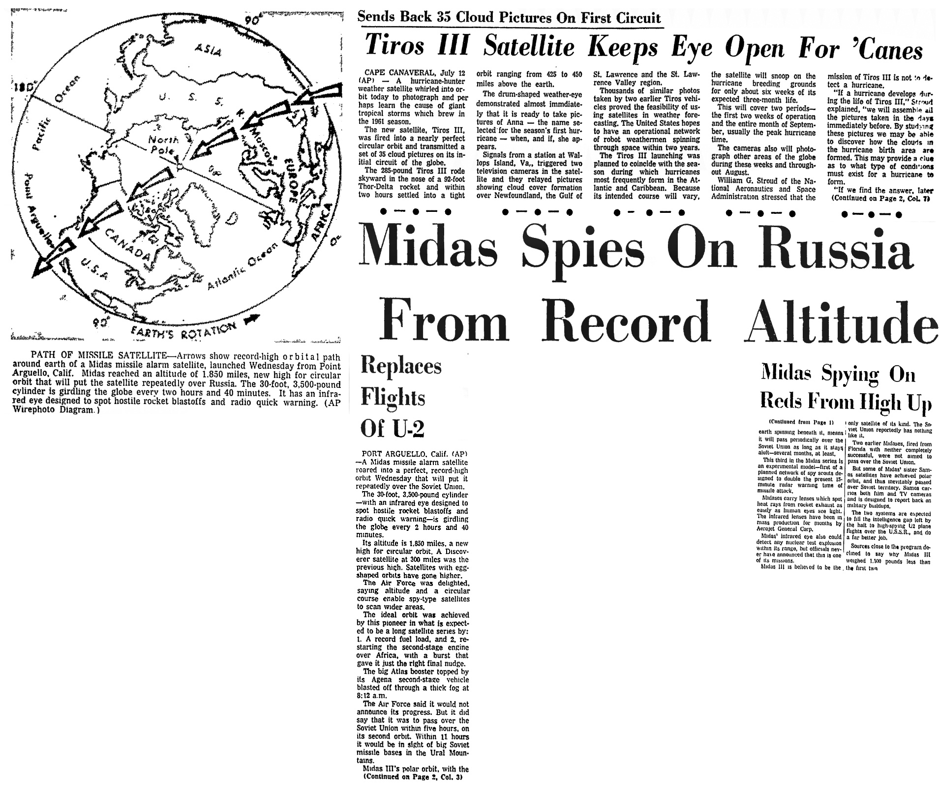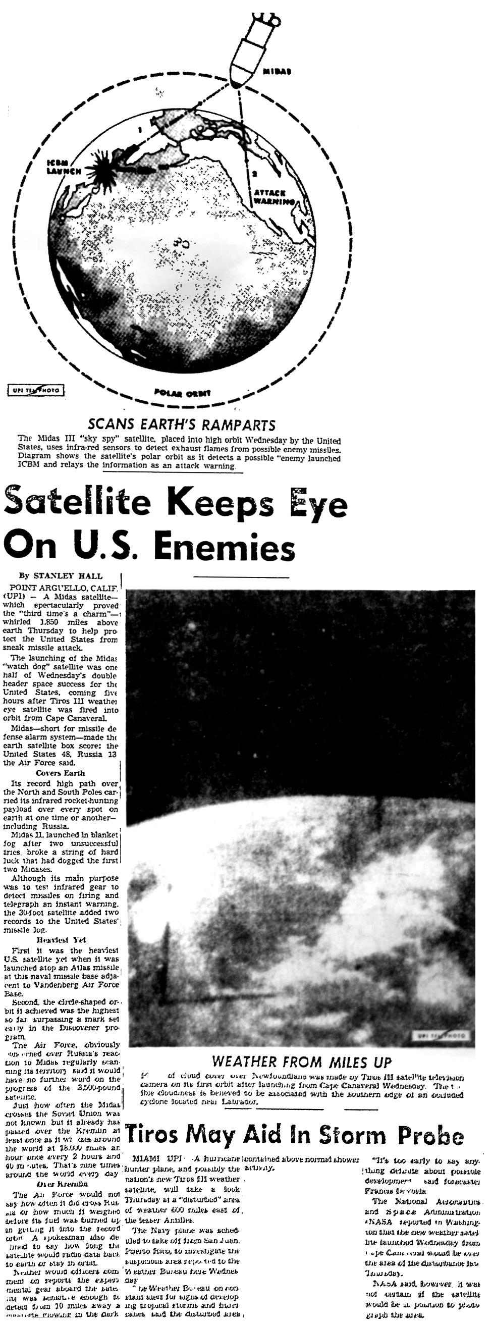 Пойнт-Аргуэлло. ВВС отменили в воскресенье попытку запуска шпионского спутника «Мидас-3» после того, как обратный отсчет дошел до нуля. Отмена никак не объясняется и дата нового запуска не объявлена.