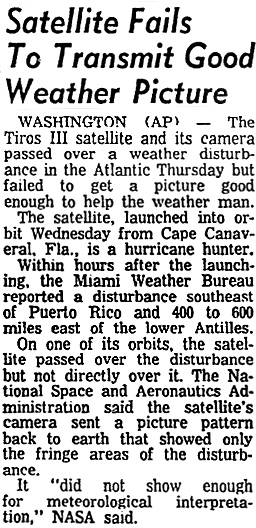 Погодное бюро сообщило, что многие из более 20’000 фотографий Земли, сделанных с «Тироса-1», первого экспериментального метеоспутника, могут быть заказаны у Национального центра метеозаписей, Эшвилль, штат Северная Каролина. Снимки доступны в 100-футовых катушках, по $4 за катушку.