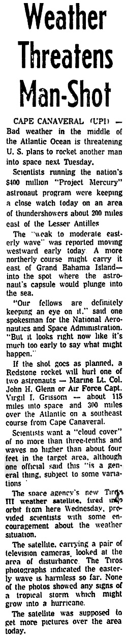 35-летний капитан ВВС Вирджил А. Гриссом, который как полагают совершит этот полет, и 39-летний подполковник морской пехоты Джон Г. Гленн, выполняли имитированные миссии в прикованной к земле капсуле, а также наблюдали, как пусковая команда проводила полномасштабный обратный отсчет для ракеты-носителя «Редстоун».