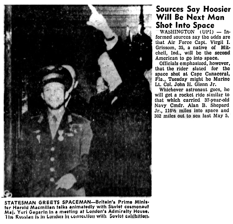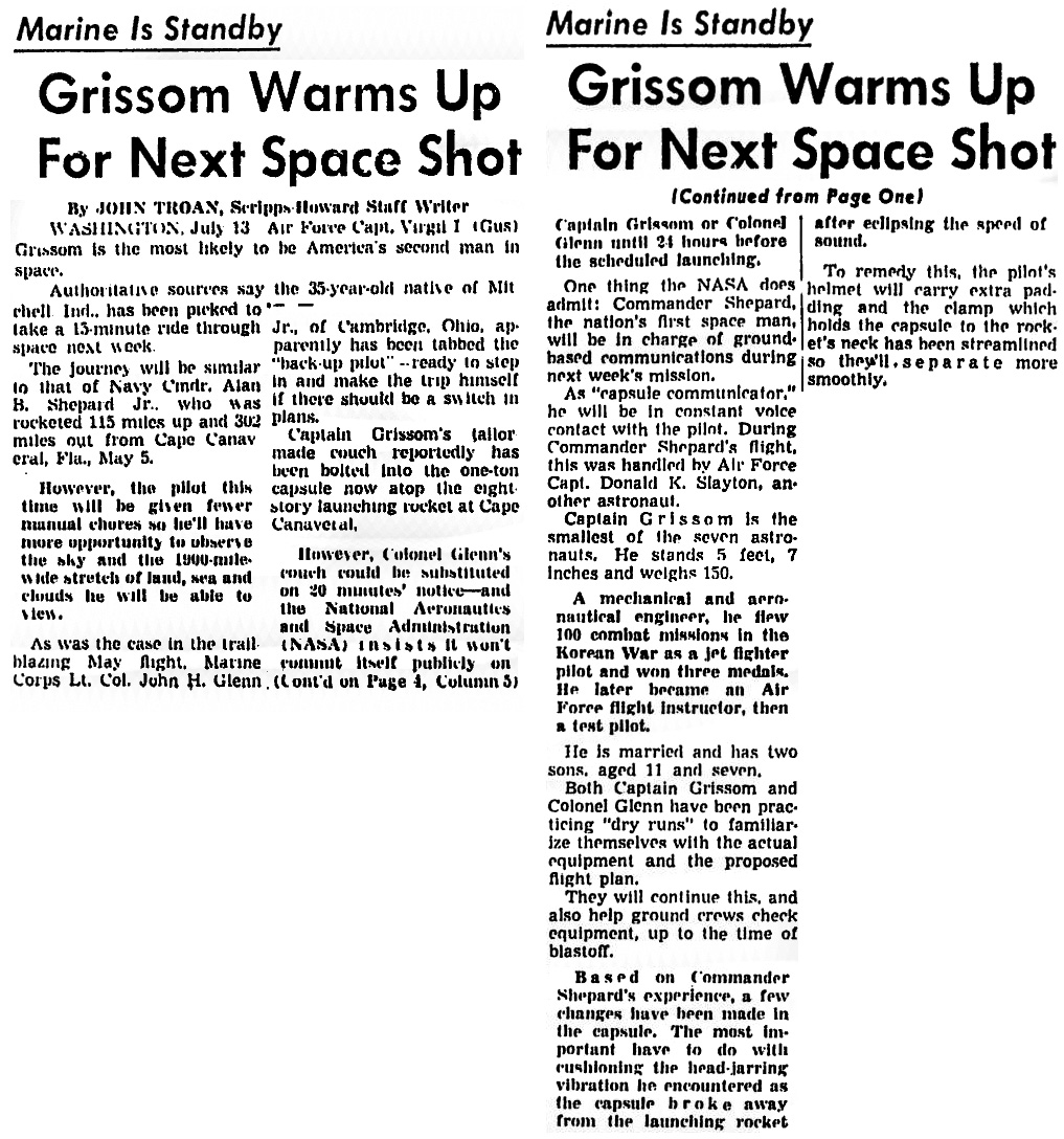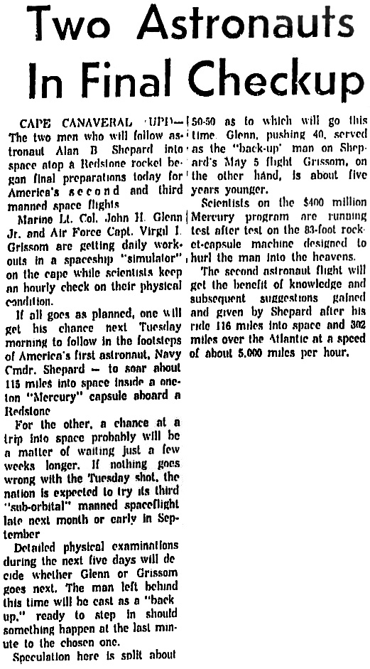 Информированные источники сообщают, что Гриссом, из Митчелла, штат Индиана, является наиболее вероятным выбором, в то время, как Гленн послужит дублером, как он делал во время совершенного в мае космического полета коммандера ВМС Алана Б. Шепарда-младшего.