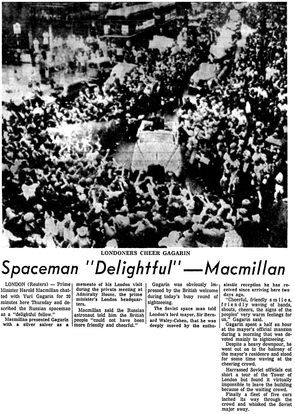 Вчера майор Гагарин пообедал с учеными Королевского общества, посетил несколько приемов и встретился в Доме Адмиралтейства с британским премьер-министром мистером Макмилланом.
