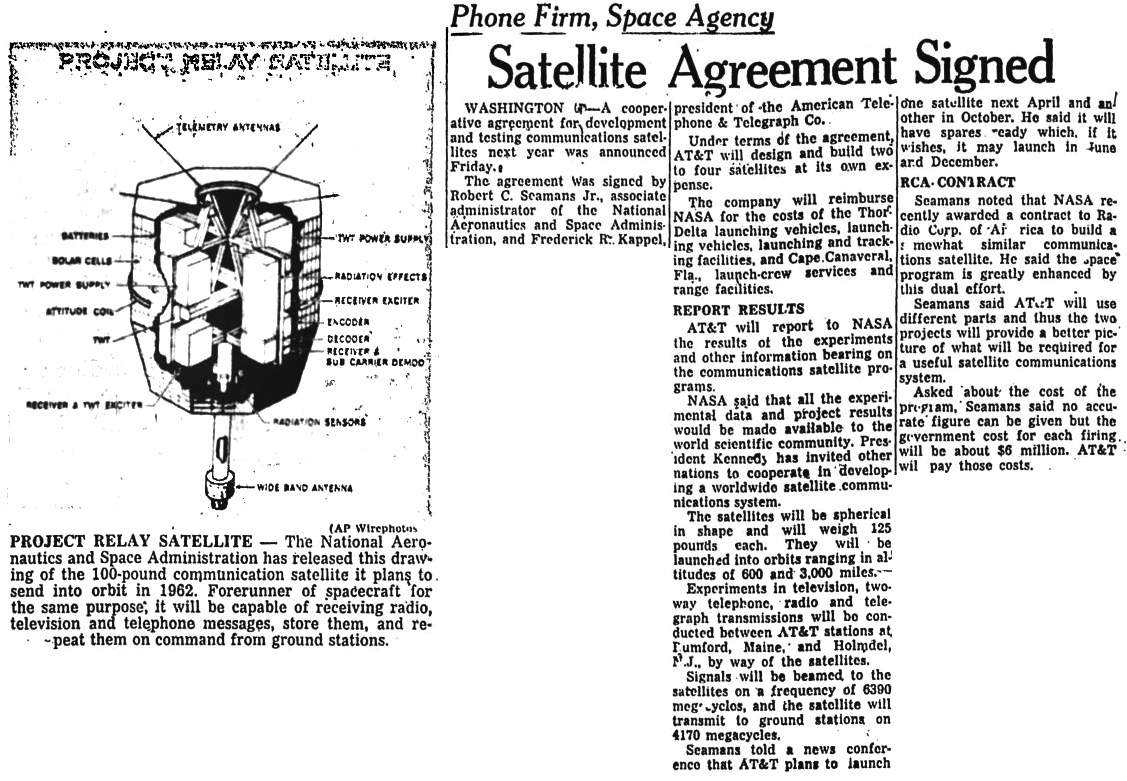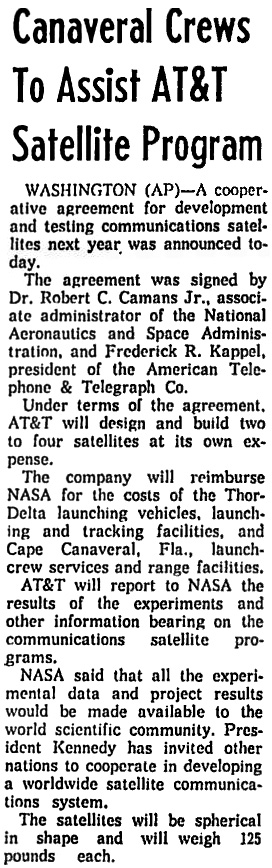 Вашингтон. Президент Кеннеди, в заявлении относительно выбранного курса, объявил, что спутниковая коммуникационная система США должна принадлежать частным компаниями и обслуживаться ими — если соблюдены определенные требования.