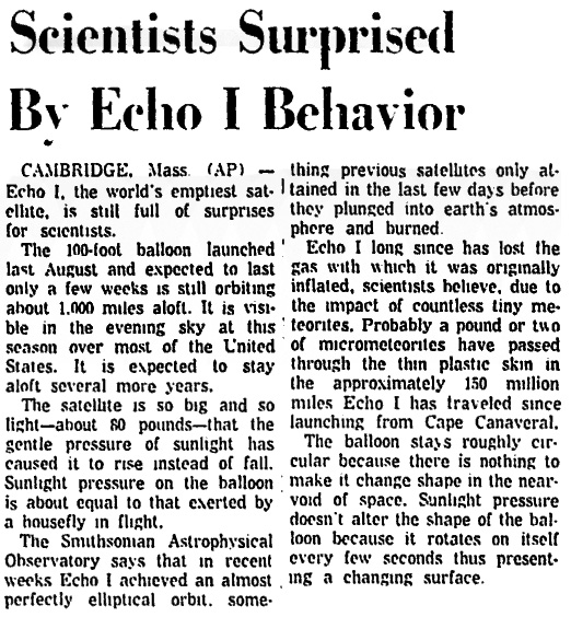 Смитсоновская астрофизическая обсерватория сообщает, что в последние недели «Эхо-1» достиг почти идеальной эллиптической орбиты – что-то, чего предыдущие спутники добивались только в последние дни перед тем, как нырнуть в атмосферу Земли и сгореть.