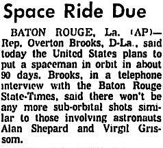 Вашингтон. Овертон Брукс, демократ от штата Луизиана, председатель Космического комитета Конгресса, сказал в пятницу, что первая попытка отправить американца на орбиту может быть сделана в начале ноября – на один-два месяца раньше графика.