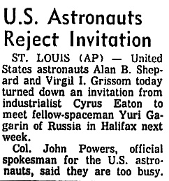 Сайрус Итон, промышленник из Кливленда, отдыхающий на своей ферме на южном побережье, объявил в понедельник, что первый человек, побывавший в космосе и принявший его приглашение посетить эту провинцию, приедет в пятницу.