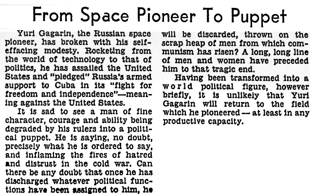 Юрий Гагарин, советский первопроходец космоса, покончил со стеснительной скромностью. Взмыв из мира технологии в мир политики, он выступил с нападками на Соединенные Штаты и «умолял» о советской военной поддержке для Кубы в ее «борьбе за свободу и независимость» - имея в виду – против Соединенных Штатов.