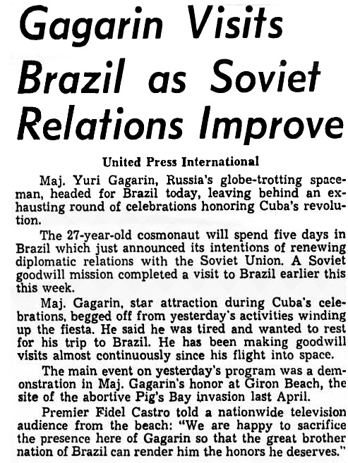 - *Гагарин начал визит в Бразилию (Gagarin Starts Brazil Visit) (на англ.) «St. Joseph News-Press», 30.07.1961 в jpg - 69 кб