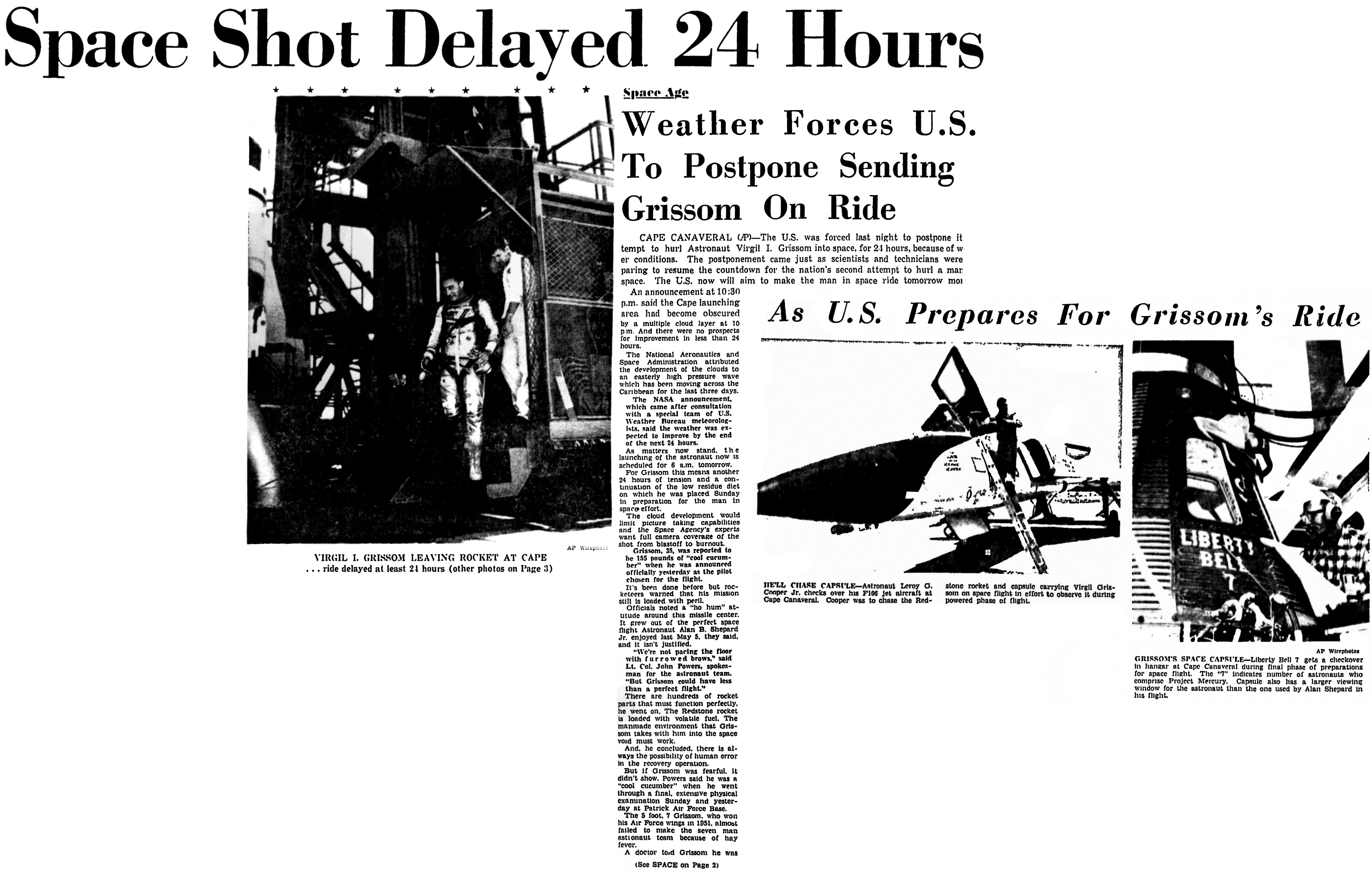 Капитан ВВС Вирджил А. Гриссом, выбранный для совершения сегодня в 5 утра по центральному времени космического вояжа, узнал о задержке у себя в жилых помещениях на мысе Канаверал, возле пусковой площадки своей капсулы «Либерти Белл-7».